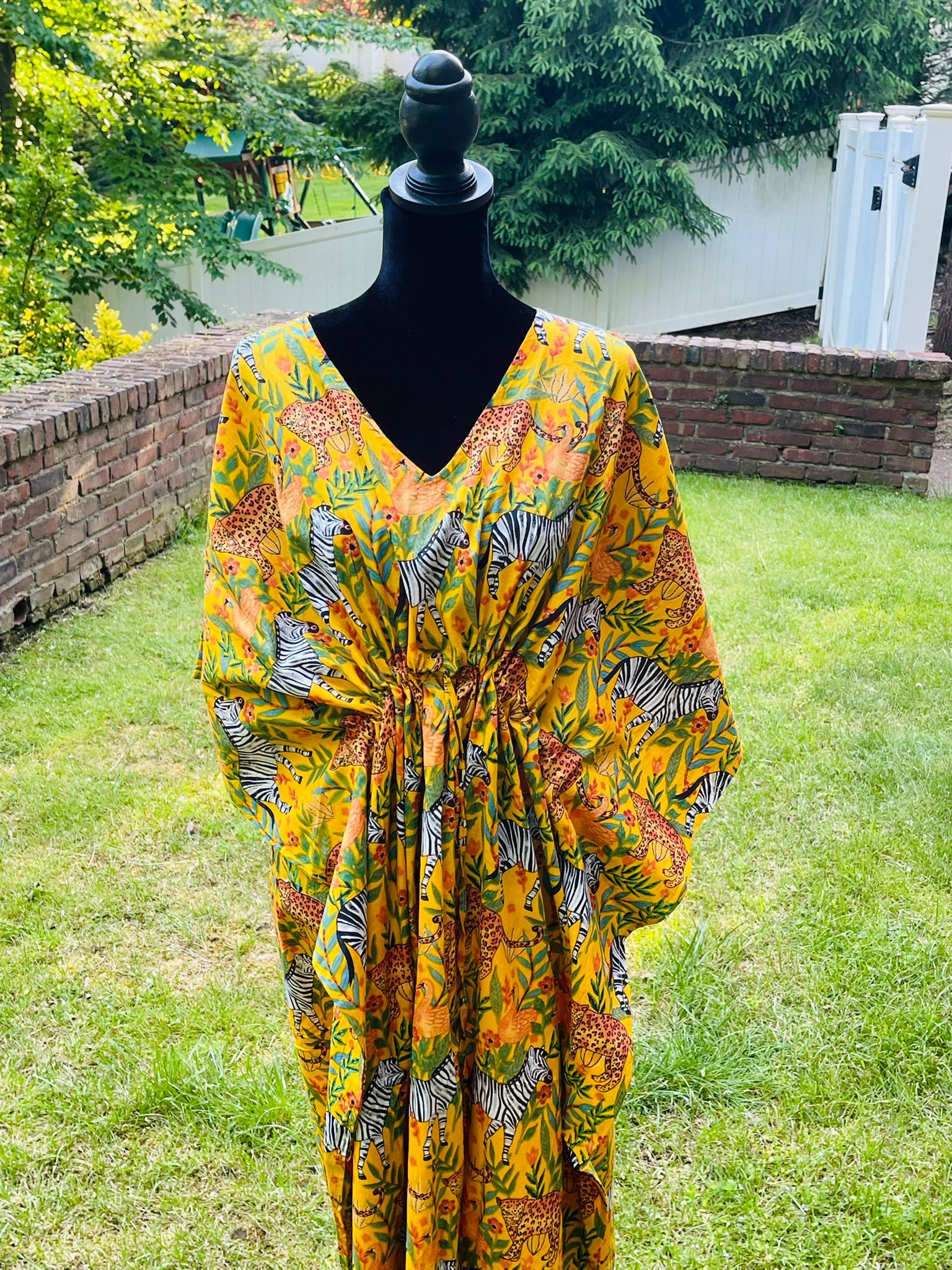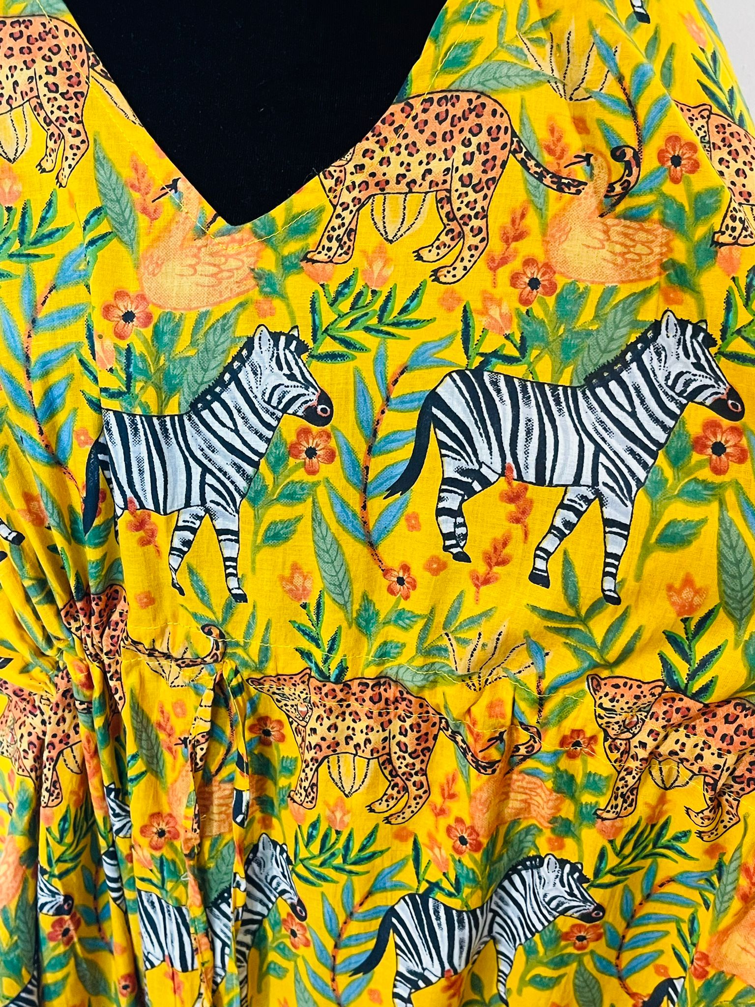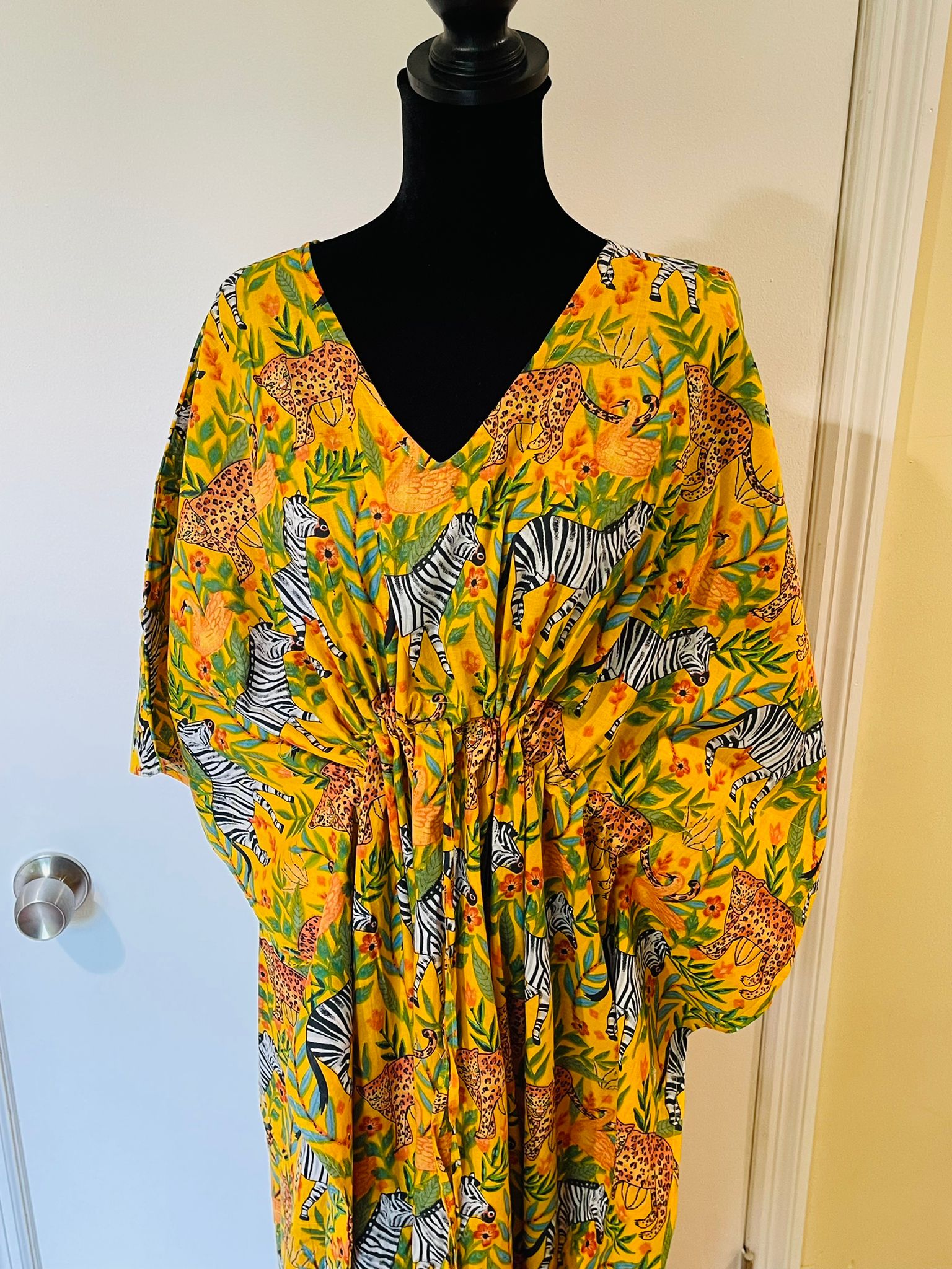 Animal Block Printed Cotton Kaftan - Yellow