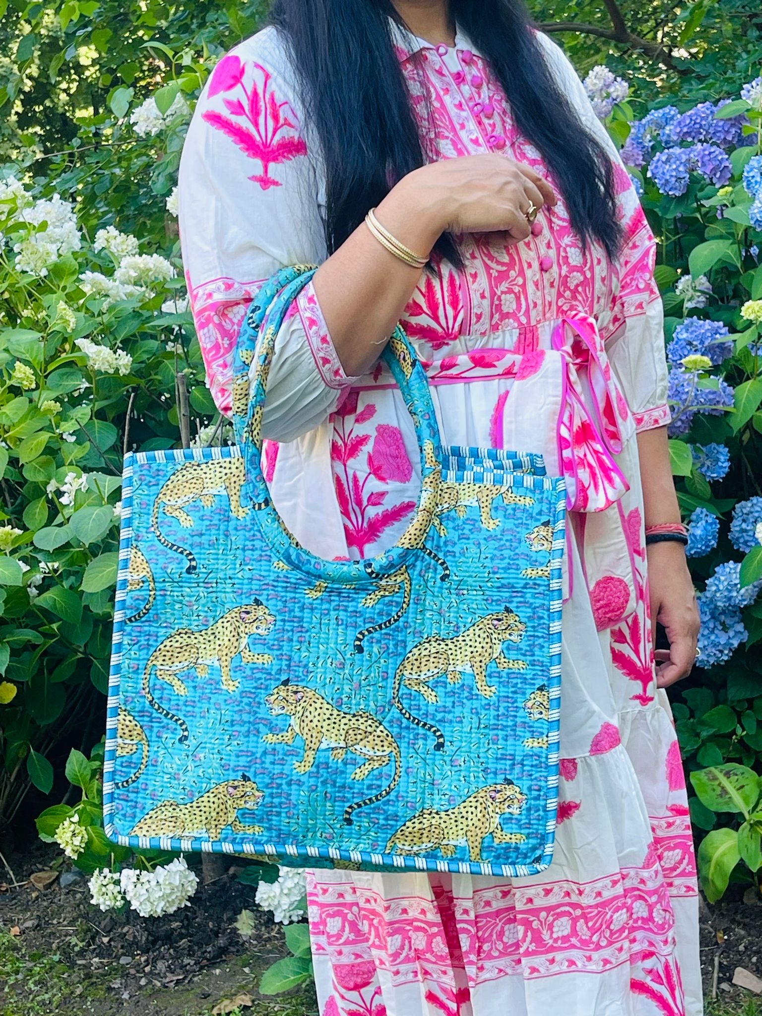 - This handcrafted beauty boasts a stunning, handprinted floral design in a vibrant multicolor palette, offering a touch of bohemian flair to every errand.