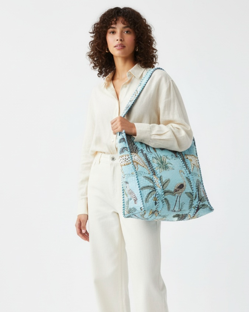 Baby Blue Animal Block Printed Tote Bag