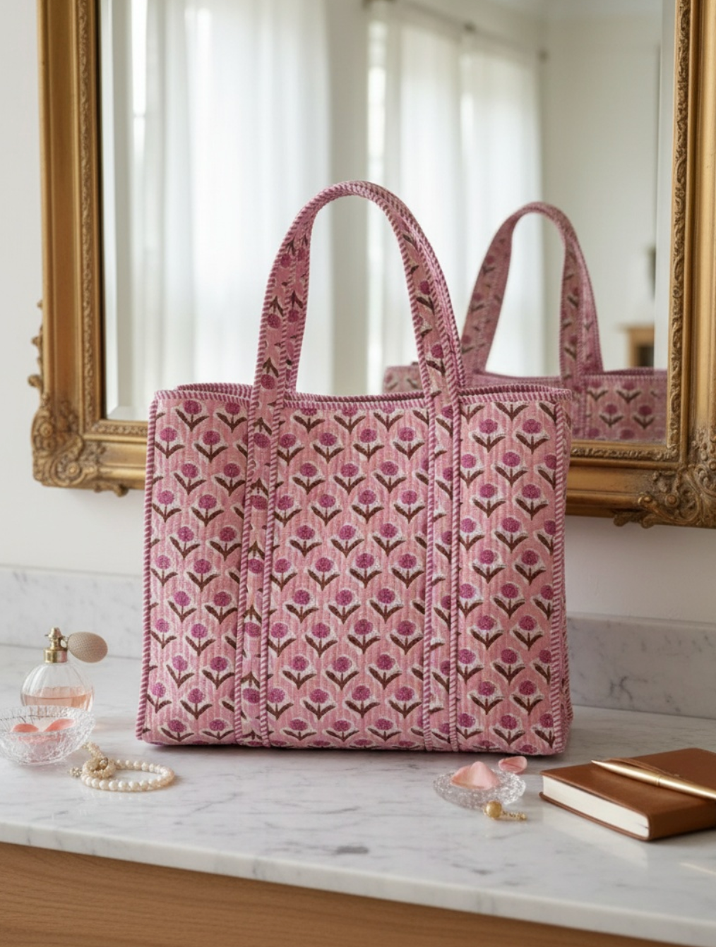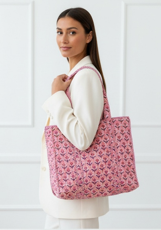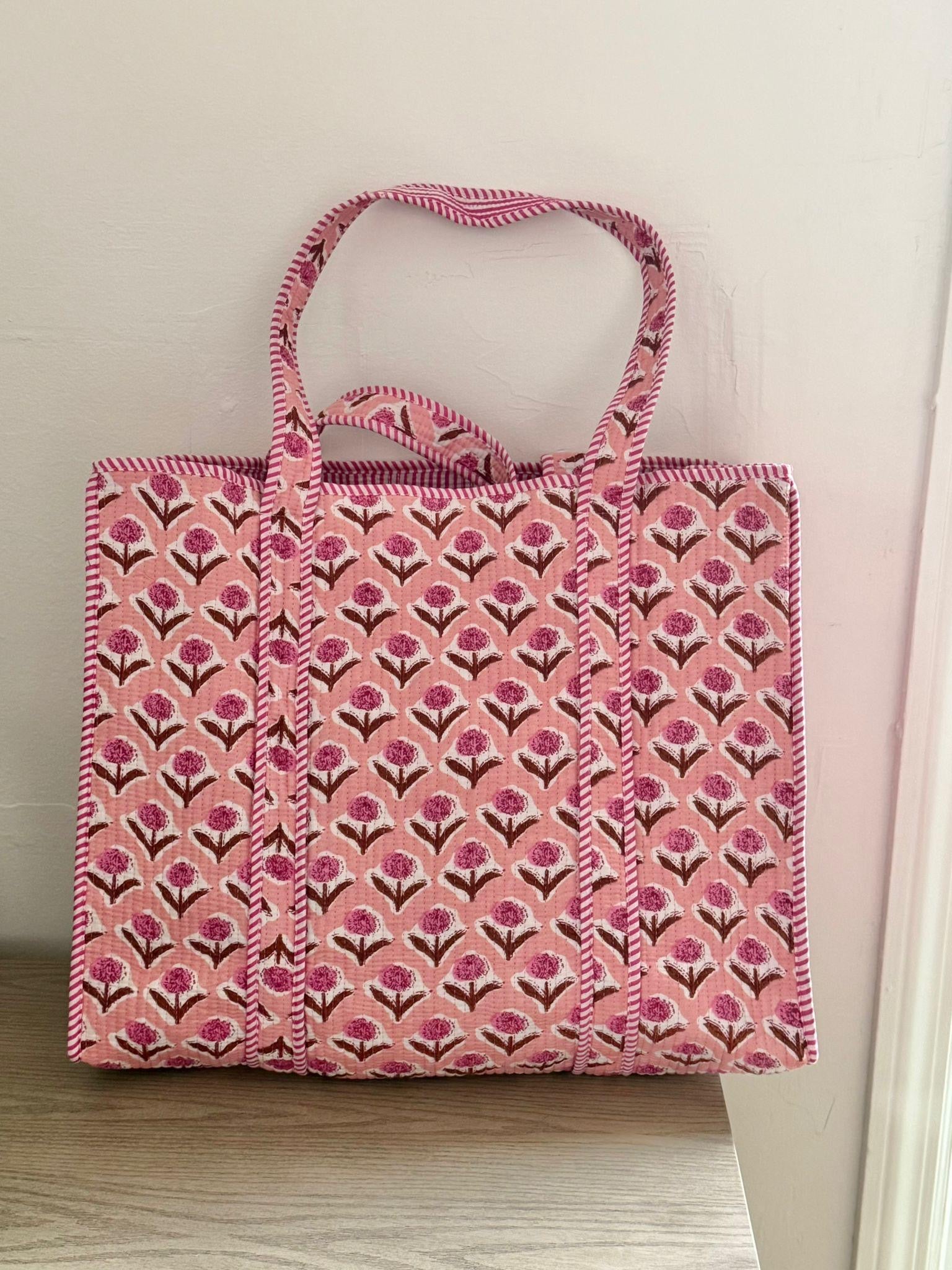 - This handcrafted beauty boasts a stunning, handprinted floral design in a vibrant multicolor palette, offering a touch of bohemian flair to every errand.