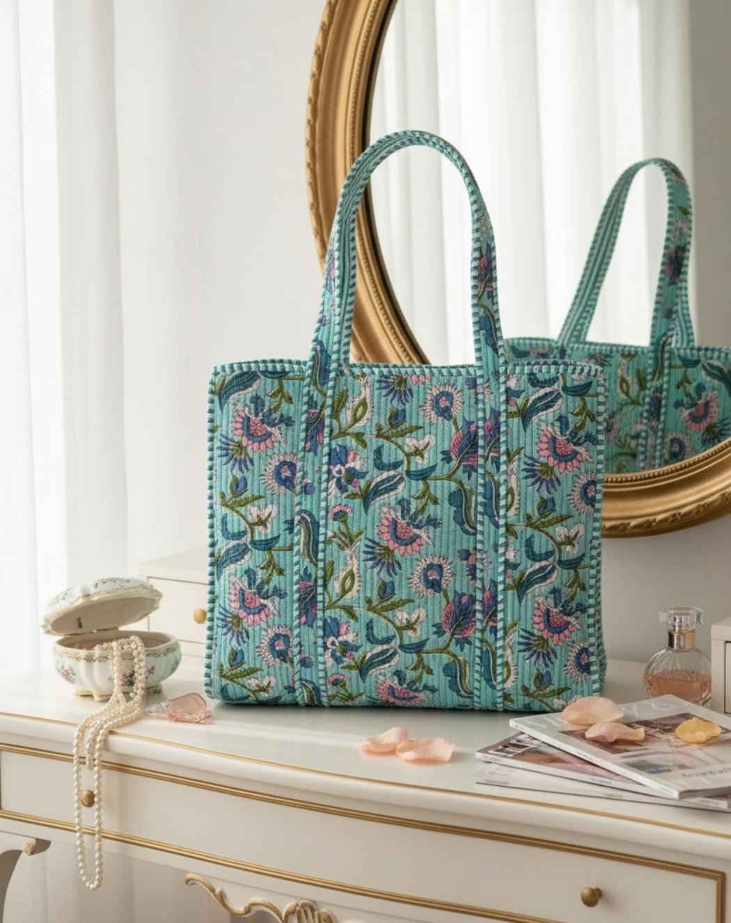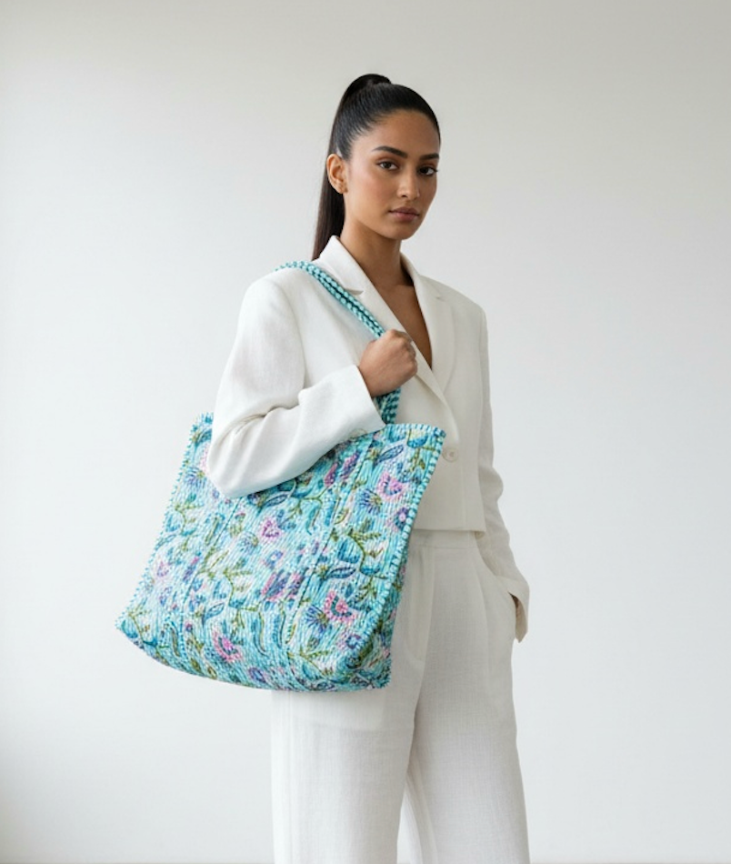 - This handcrafted beauty boasts a stunning, handprinted floral design in a vibrant multicolor palette, offering a touch of bohemian flair to every errand.