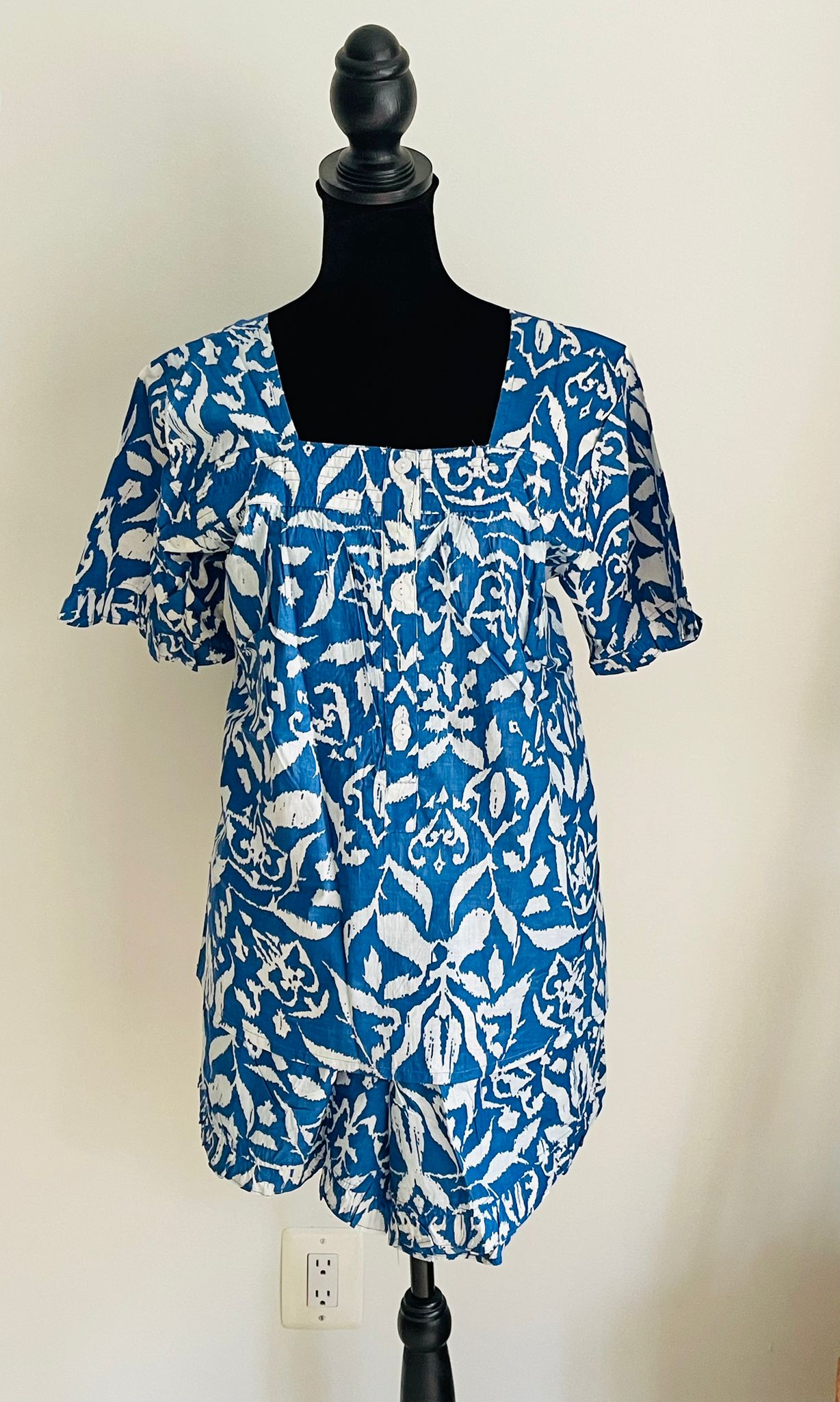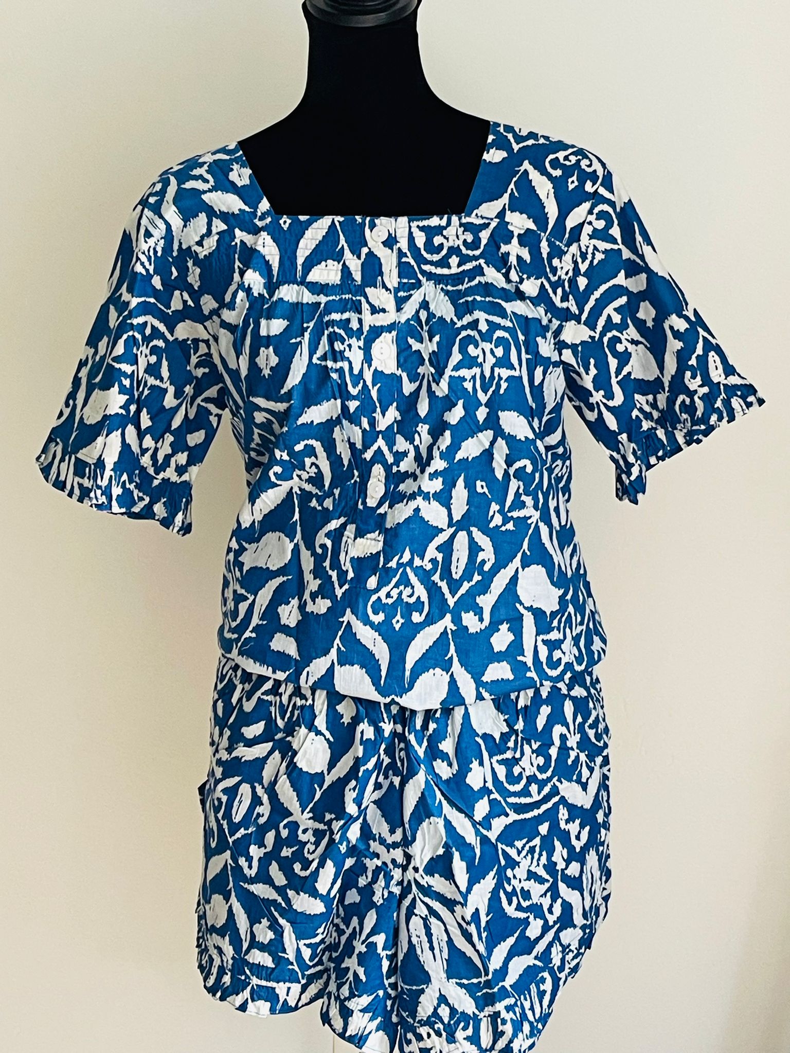 - Reminiscent of old pajama designs, the short sleeved top has a button-down construction. The elastic waistband of the matching pocket shorts ensures a snug fit and maximum comfort.