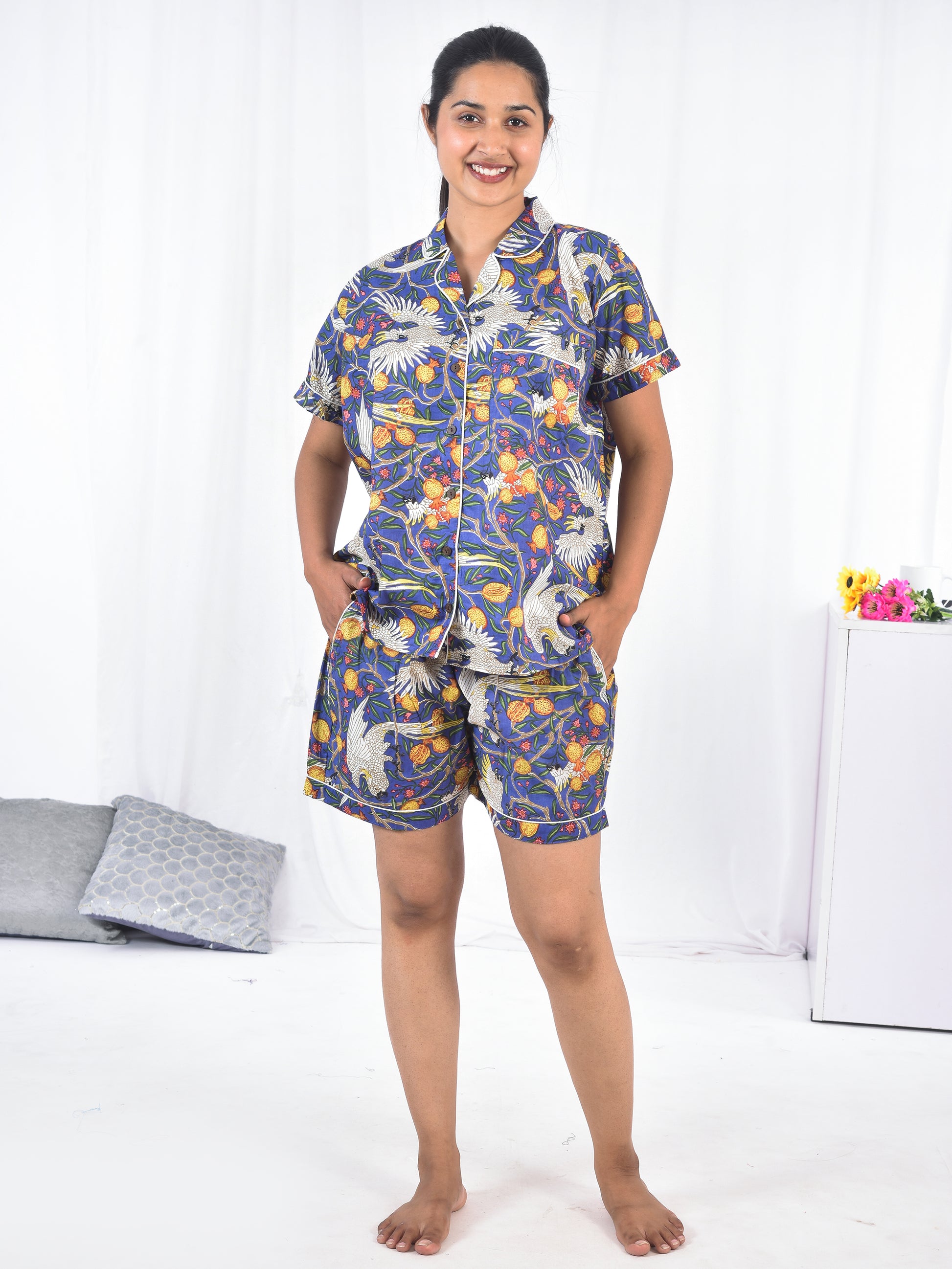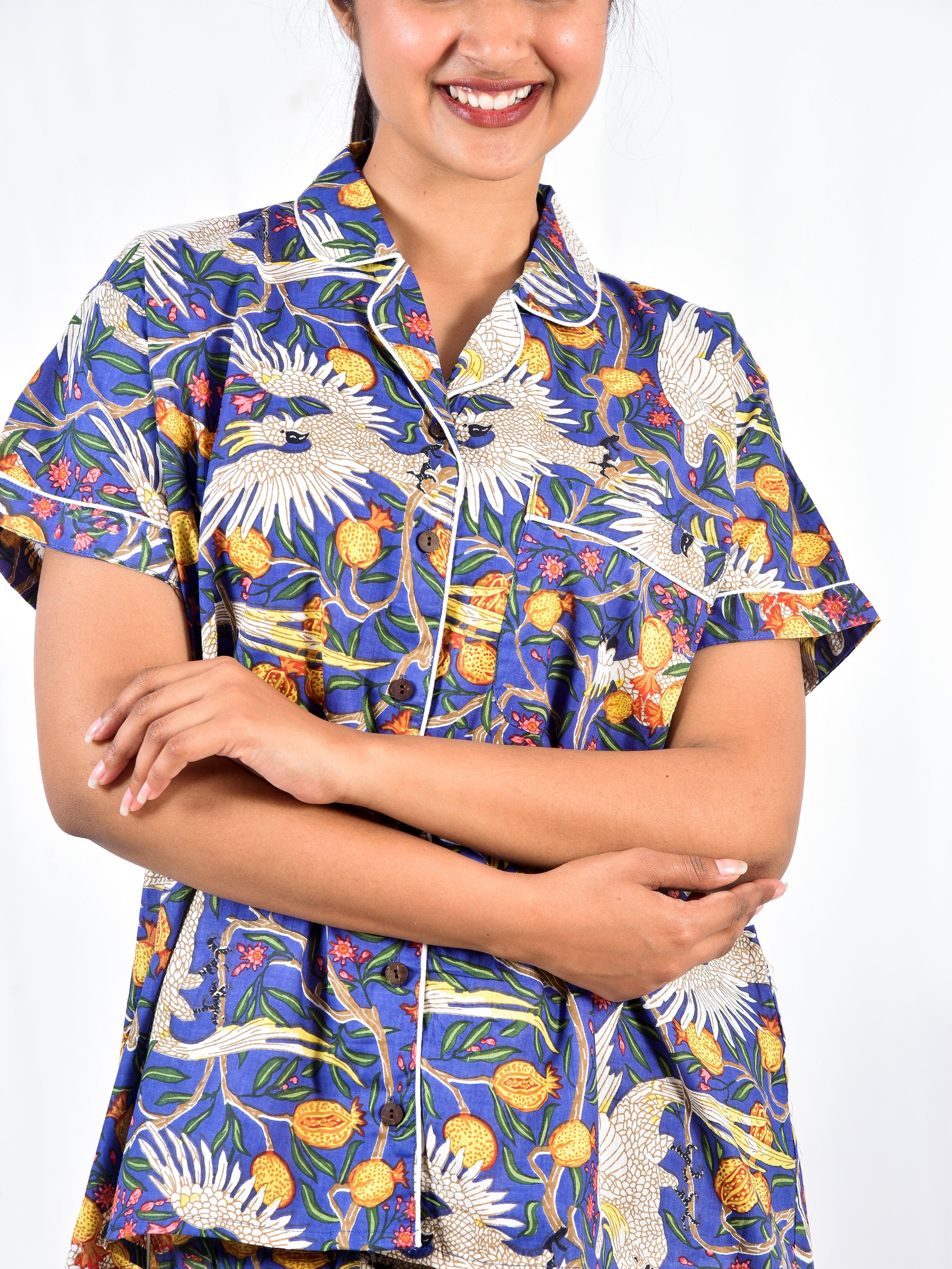 - Reminiscent of old pajama designs, the short sleeved top has a button-down construction with a classic collar. The elastic waistband of the matching pocket shorts ensures a snug fit and maximum comfort.