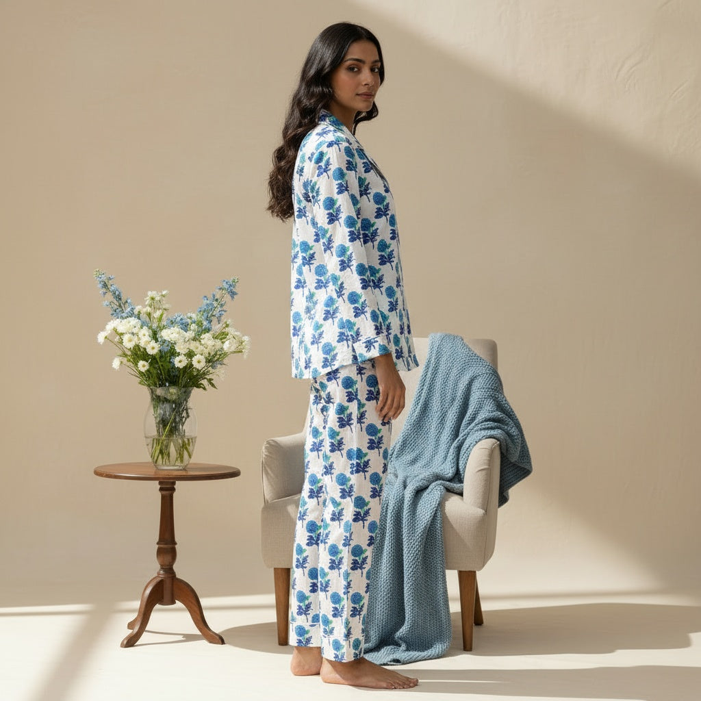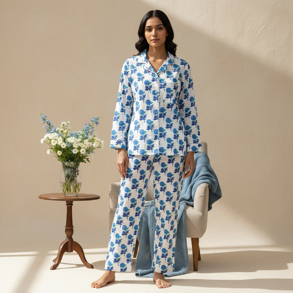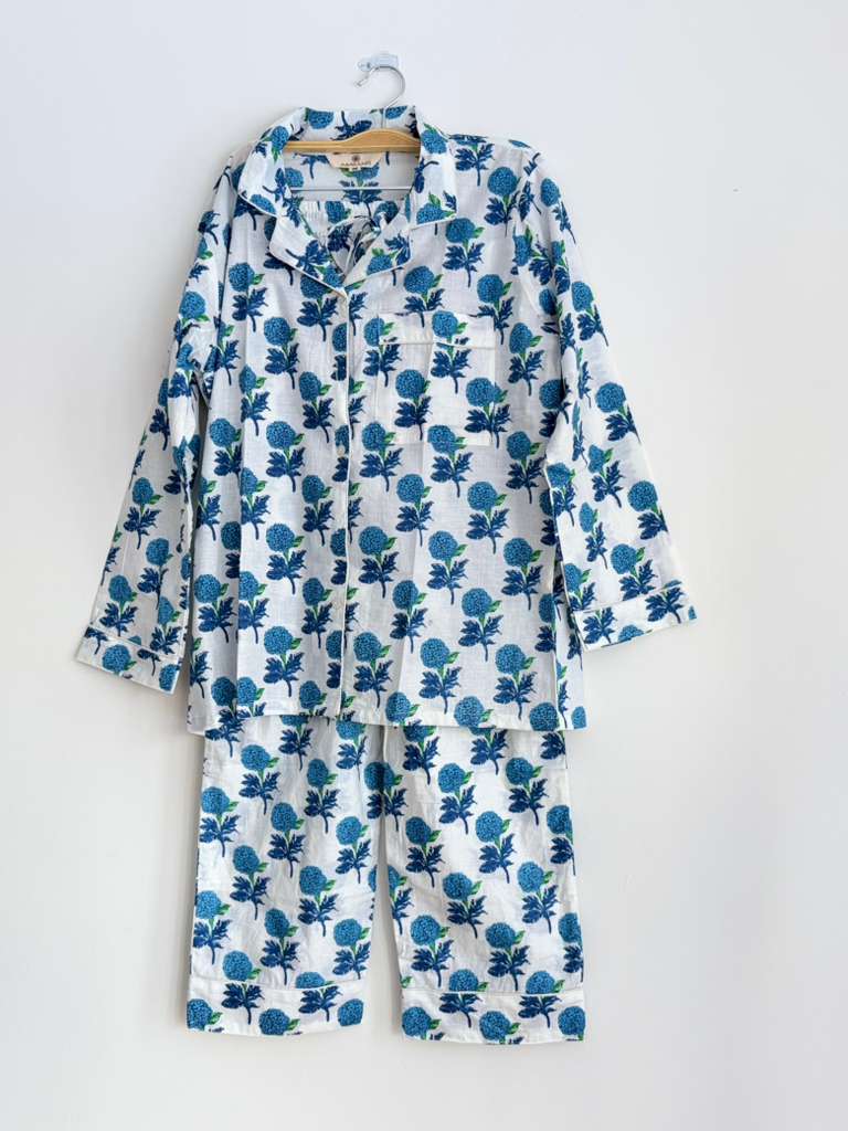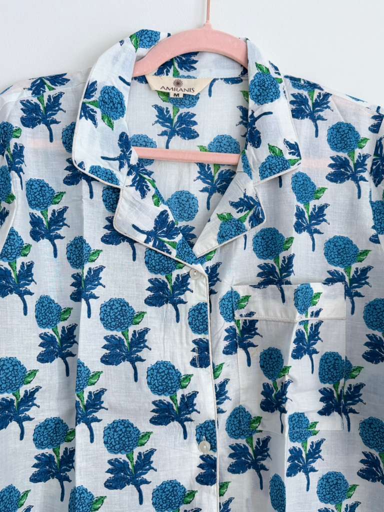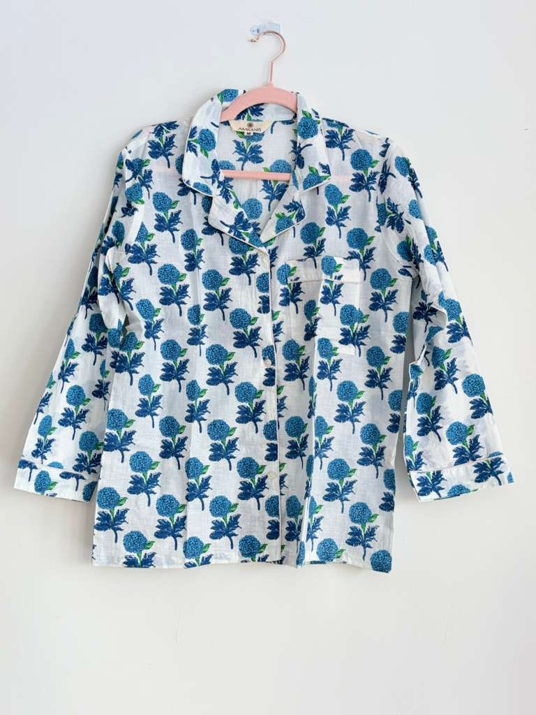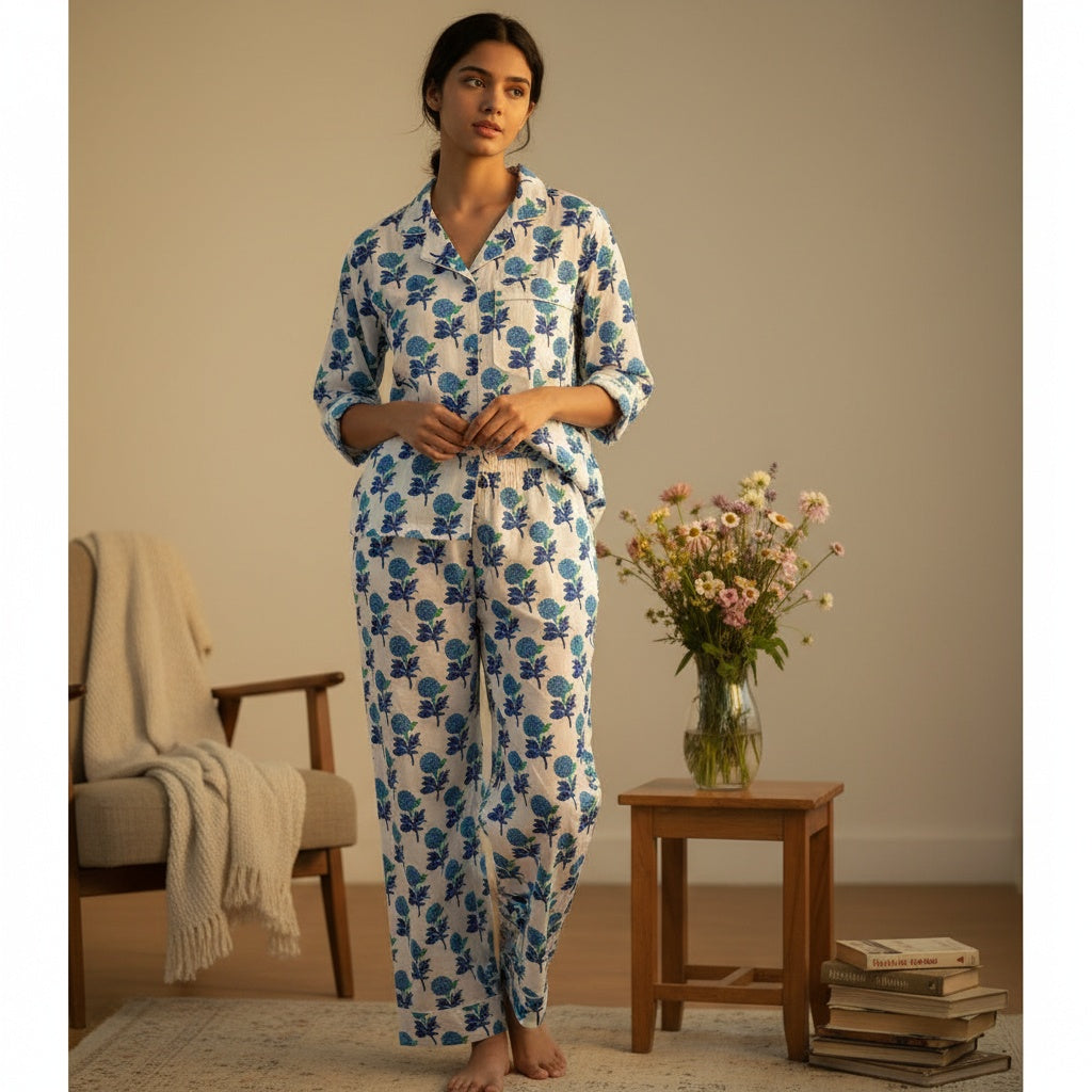 This chic set is comfortable as well as feminine, making it a perfect wear for a relaxed evening at home. Club those fluffy room slippers with this one to soak in a chill vibe. 100% COTTON BLOCK PRINT HAND MADE PJ SET Shirt Features: Lapel collar Three-quarter sleeves Pyjamas Features : Elasticated waist with drawstring closure 2 pockets on the sides