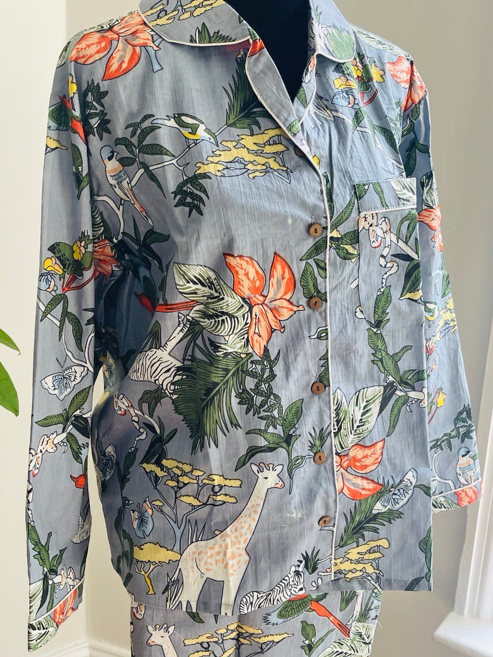 - Reminiscent of old pajama designs, the top has a button-down construction with a classic collar. The elastic waistband of the matching pocket pants ensures a snug fit and maximum comfort.