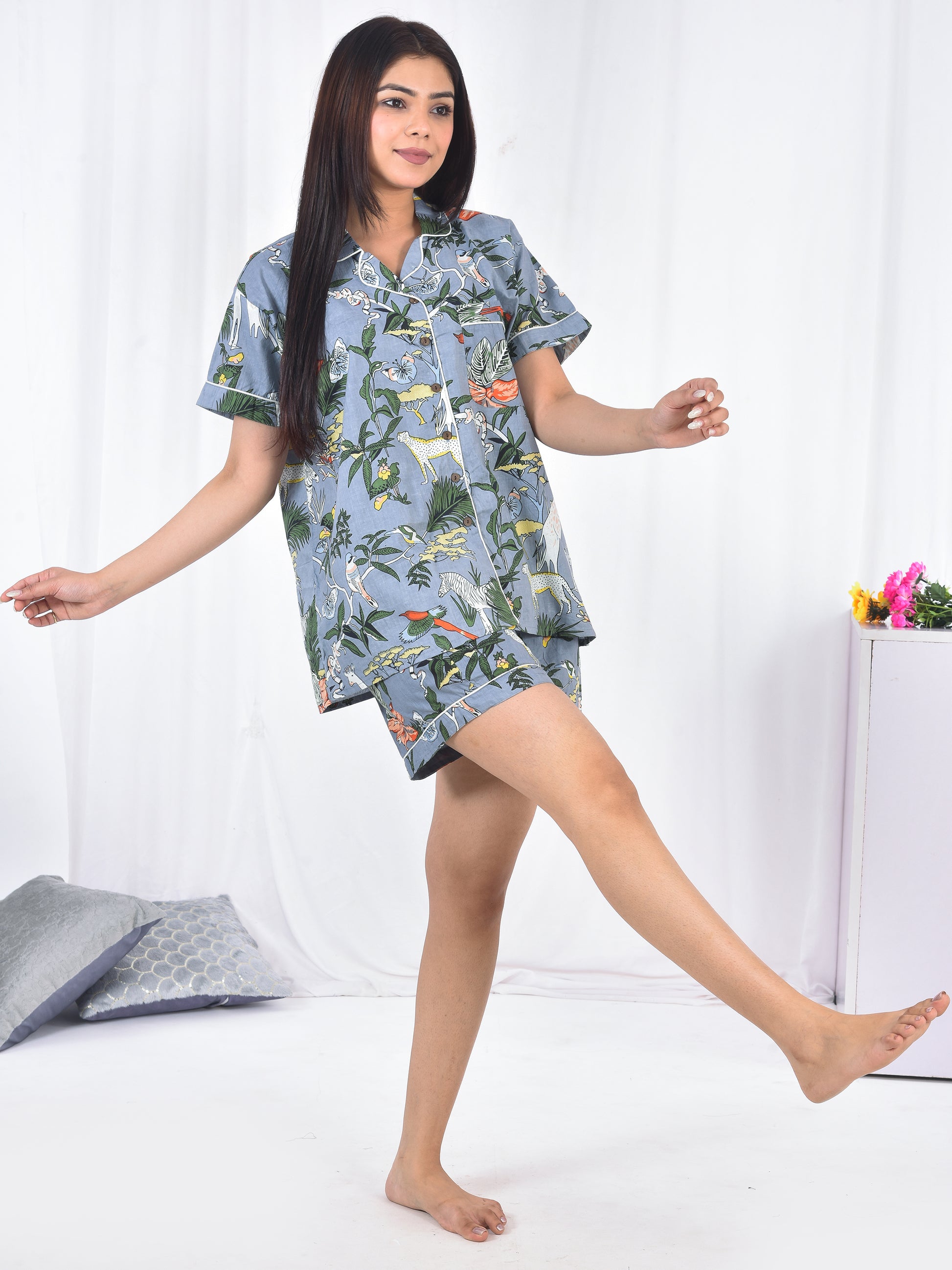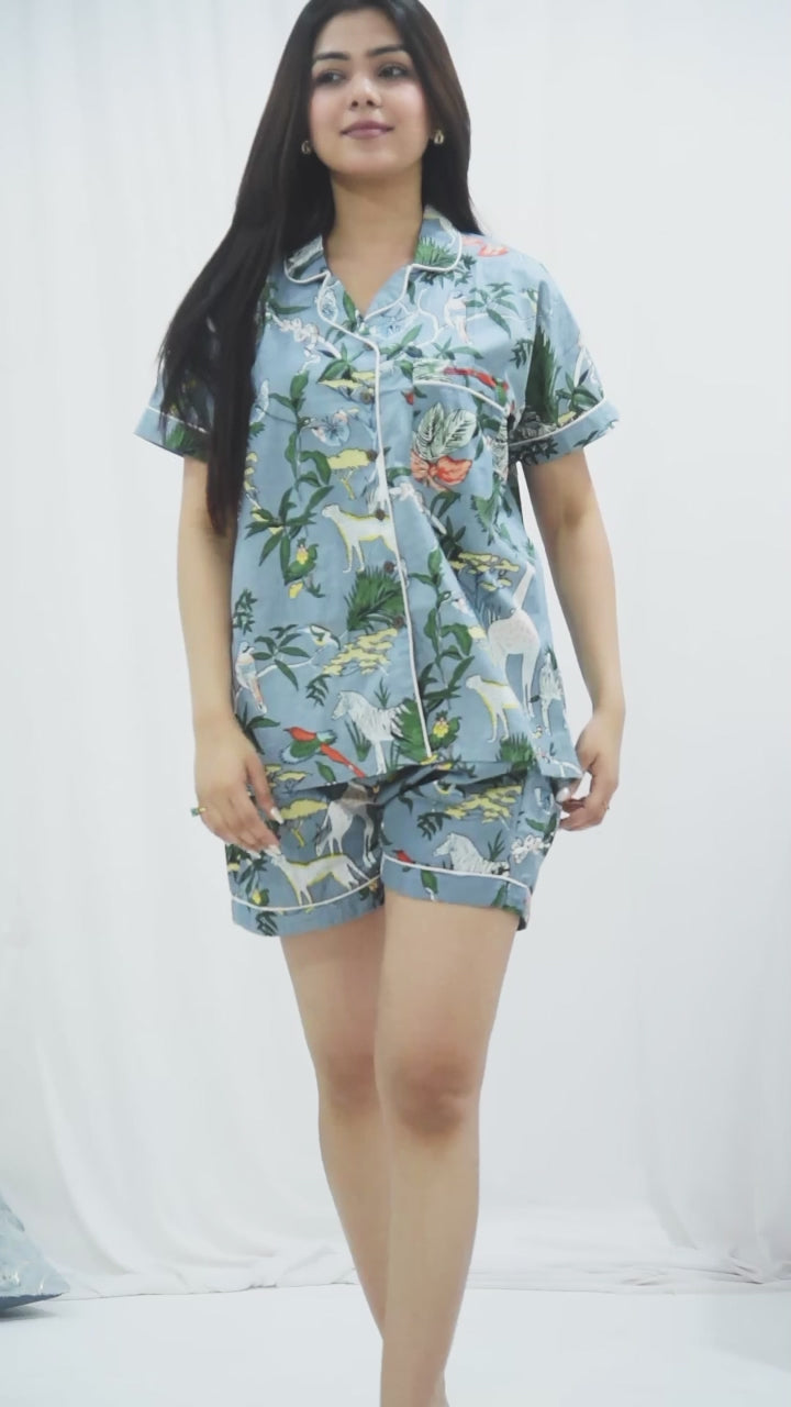 - Reminiscent of old pajama designs, the short sleeved top has a button-down construction with a classic collar. The elastic waistband of the matching pocket shorts ensures a snug fit and maximum comfort.