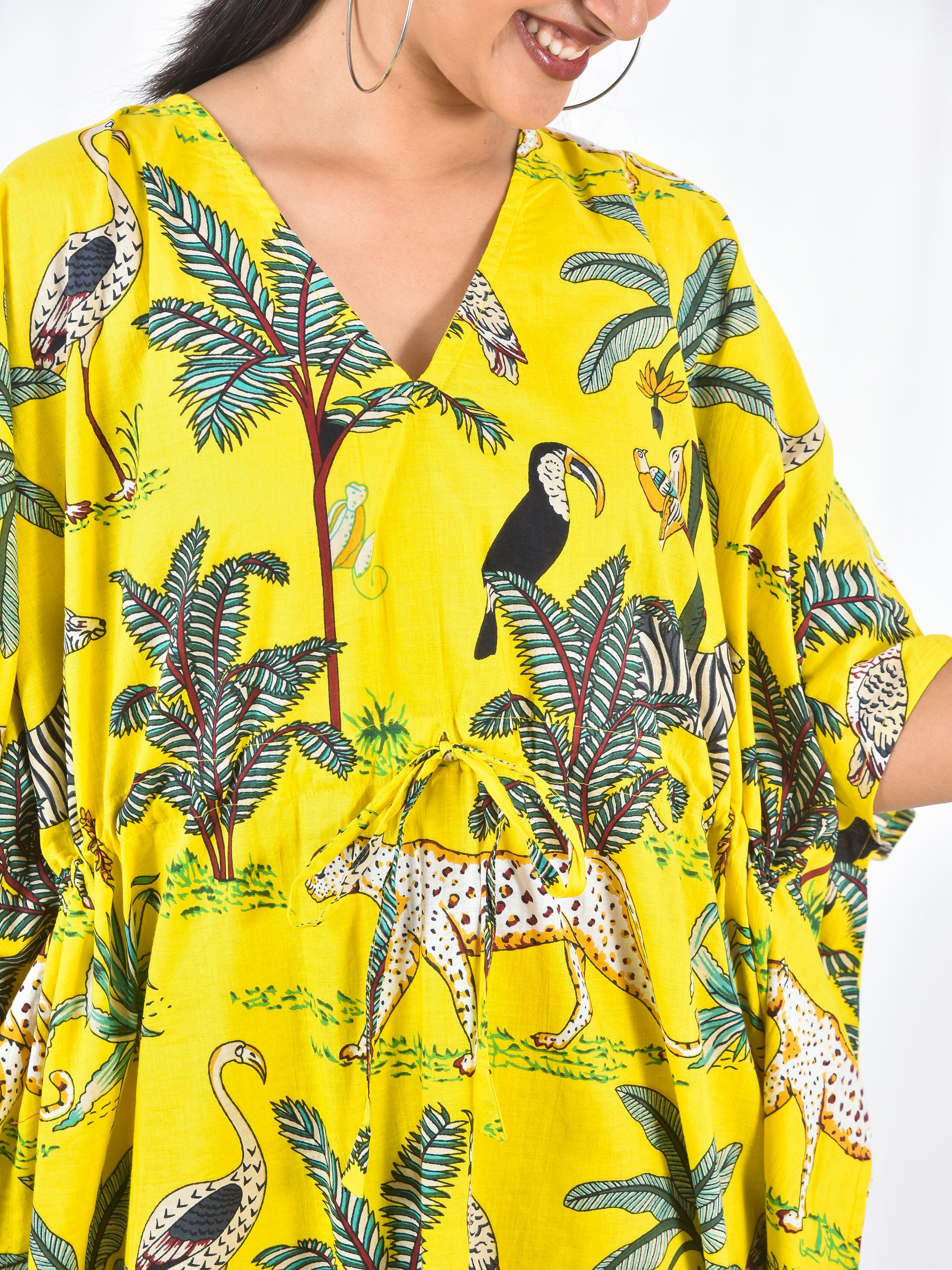 Hand Block Animal Printed Cotton Kaftan - Yellow