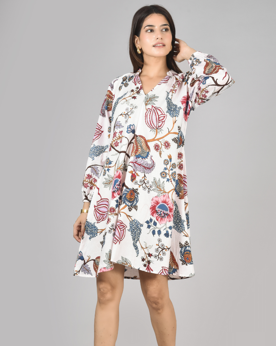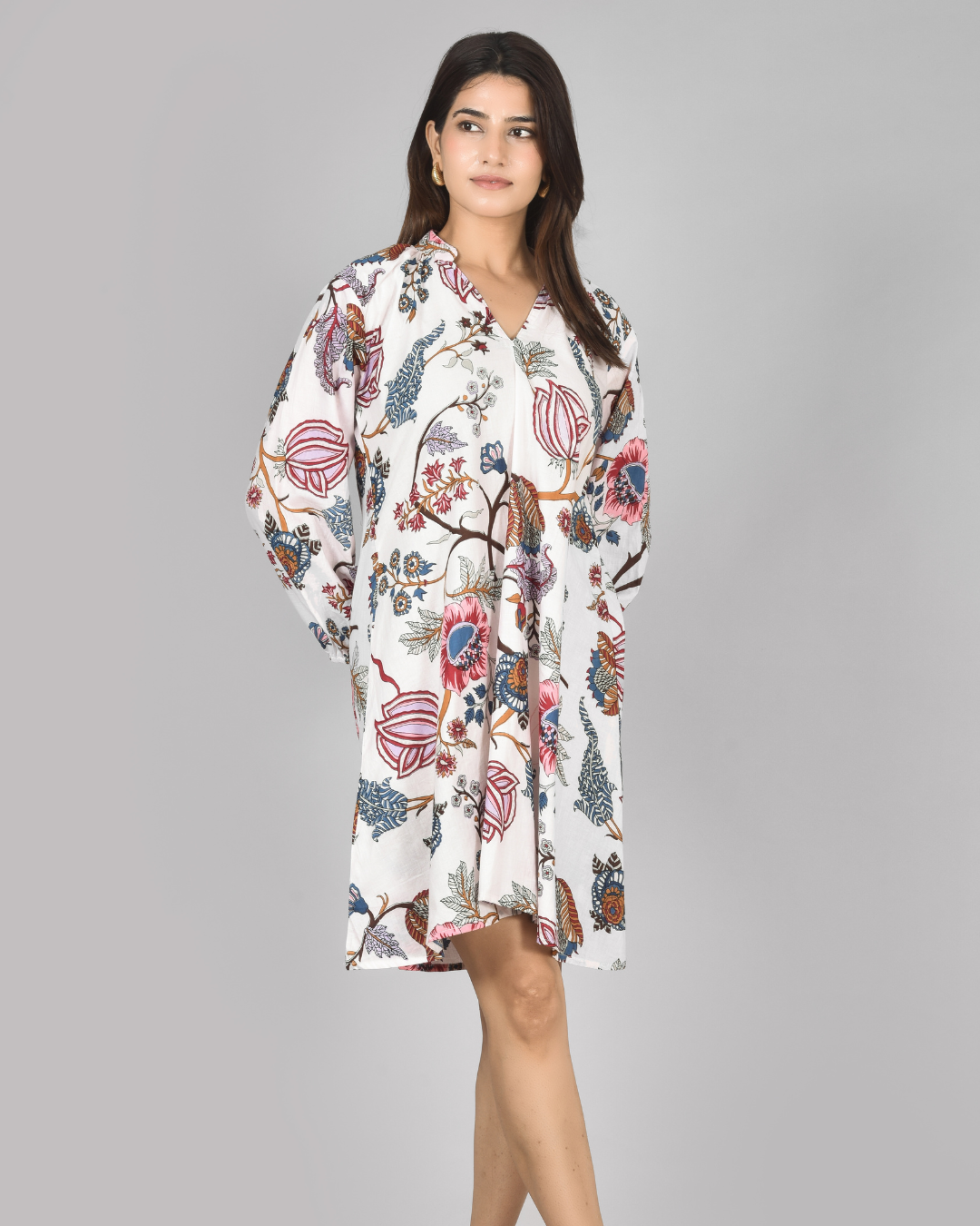Tailored in 100% cotton and finished with full length sleeves with gathered cuffs, a flattering V-neckline, and a breezy A-line silhouette.