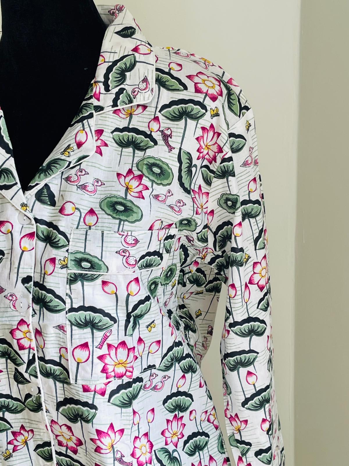 - Reminiscent of old pajama designs, the top has a button-down construction with a classic collar. The elastic waistband of the matching pocket pants ensures a snug fit and maximum comfort.