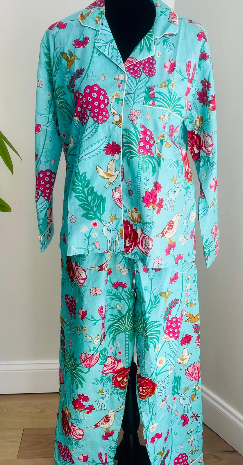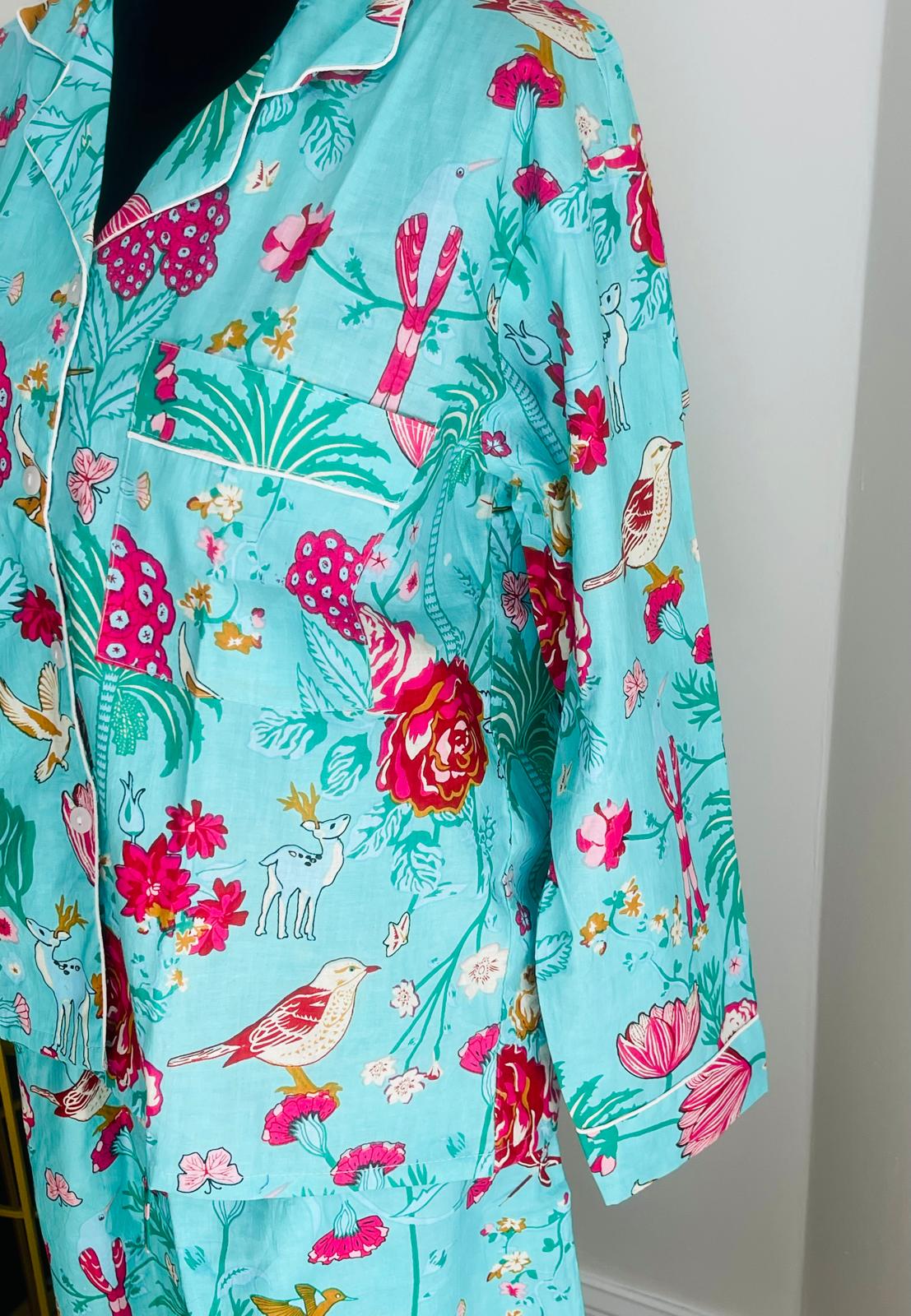 - The top features a classic collar and button-down design, reminiscent of traditional pajama styles. The matching pocket pants boast an elastic waistband for a secure fit and ultimate comfort.