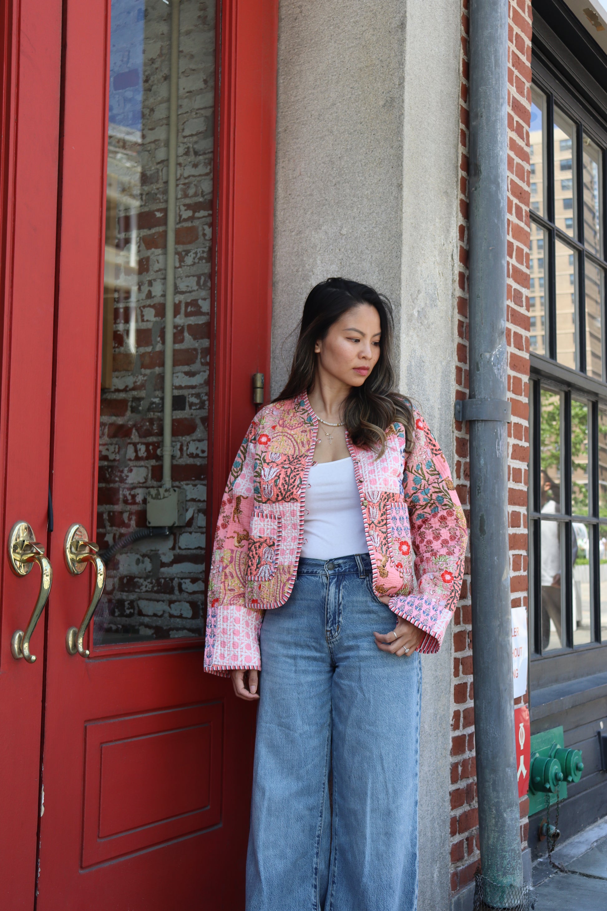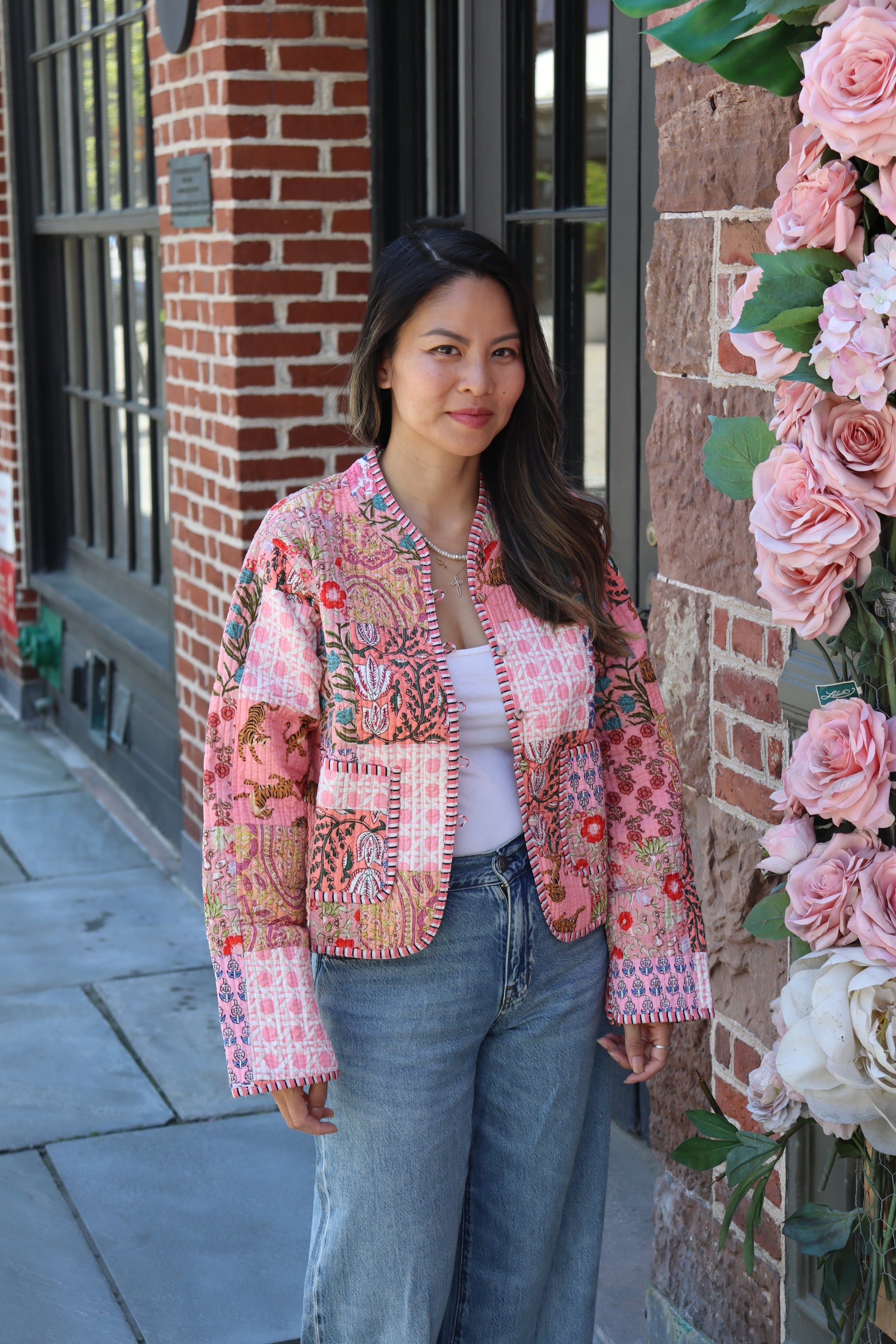 Add a pop of color and artisanal charm to your wardrobe with our Floral Hand-Quilted Cotton Jacket in vibrant Pink. This eye-catching piece features a striking all-over floral print, intricately hand-quilted on soft, breathable cotton. The comfortable fit and flattering silhouette make it a perfect choice for casual outings, creative workspaces, or travel-ready style.