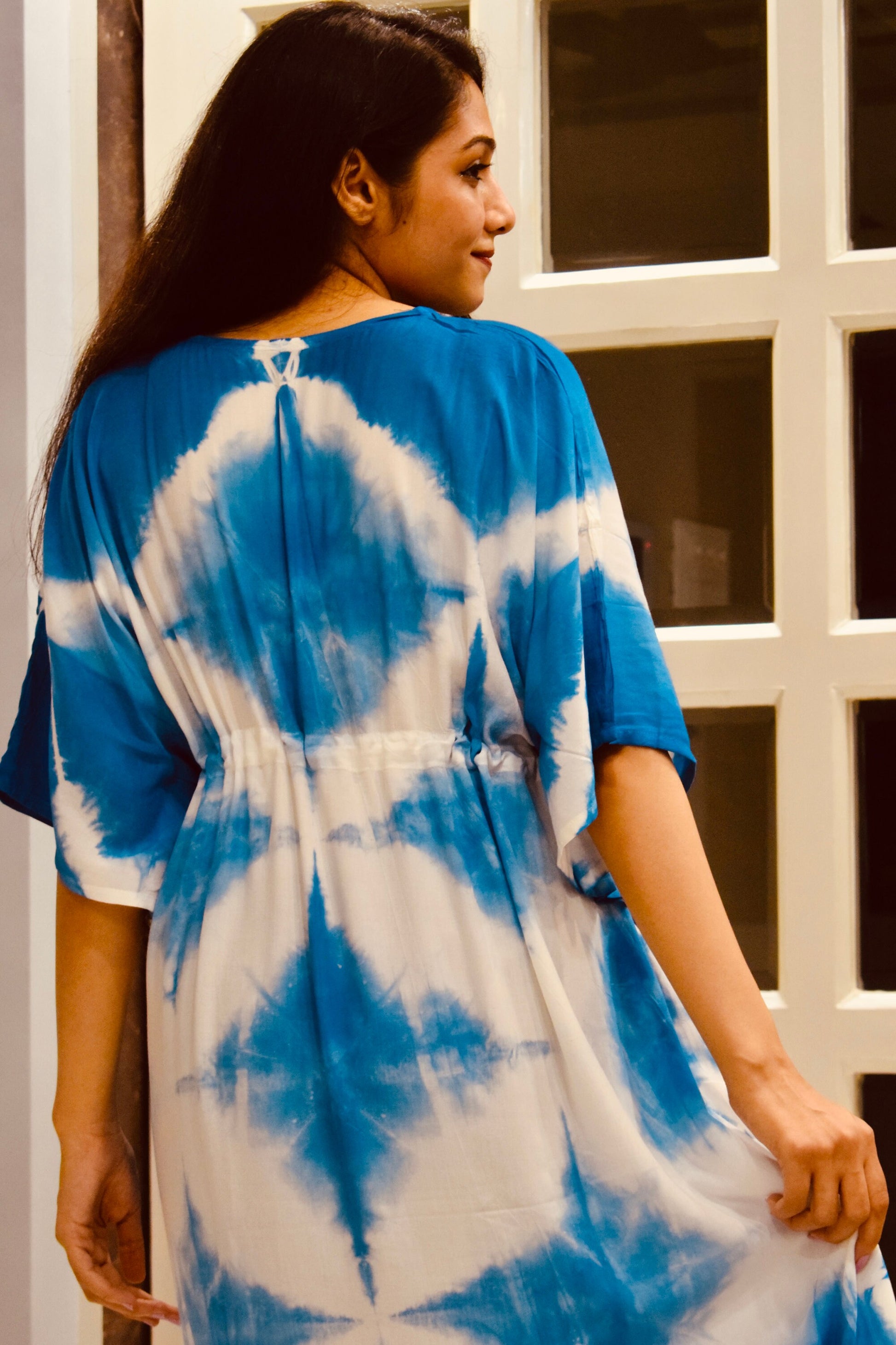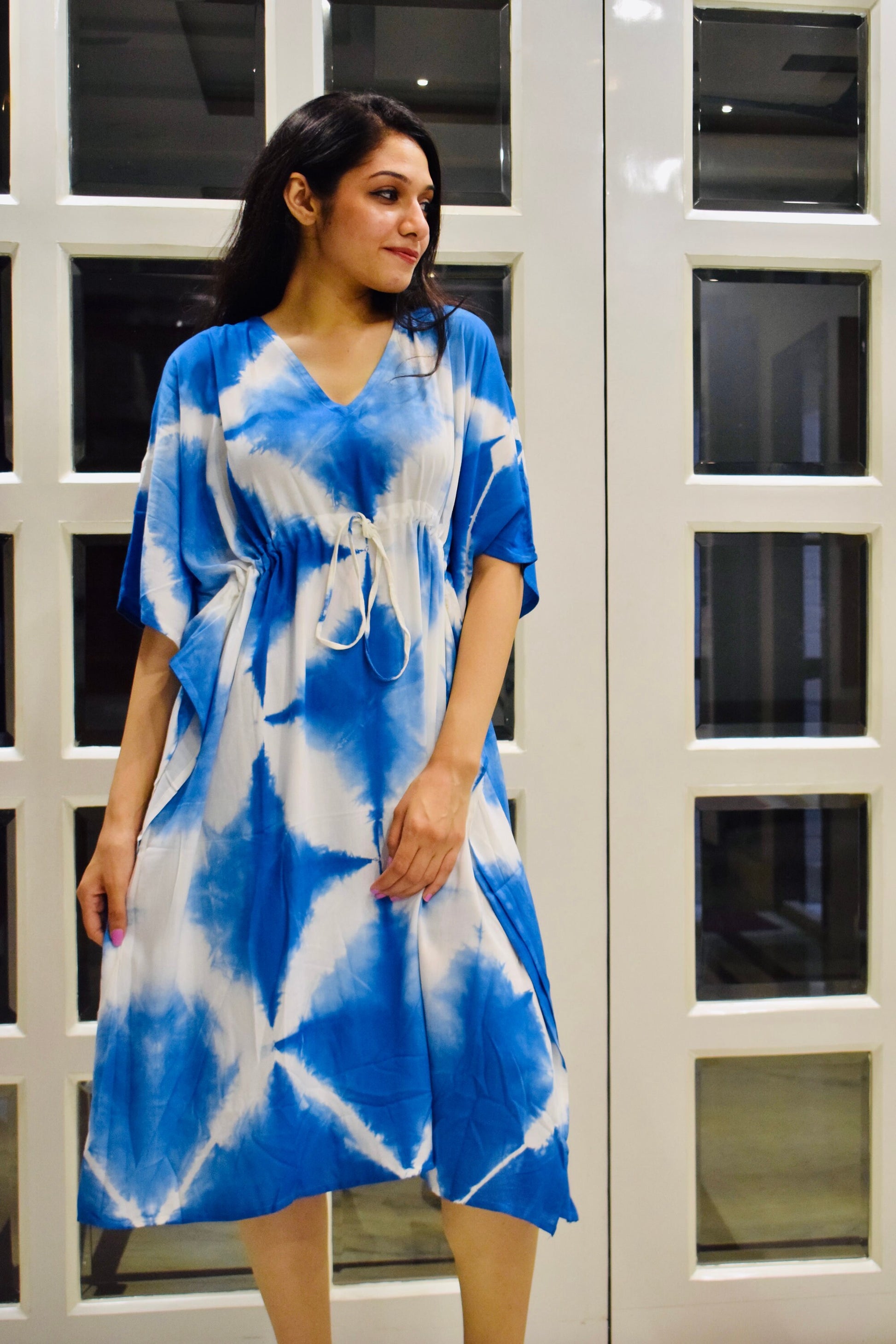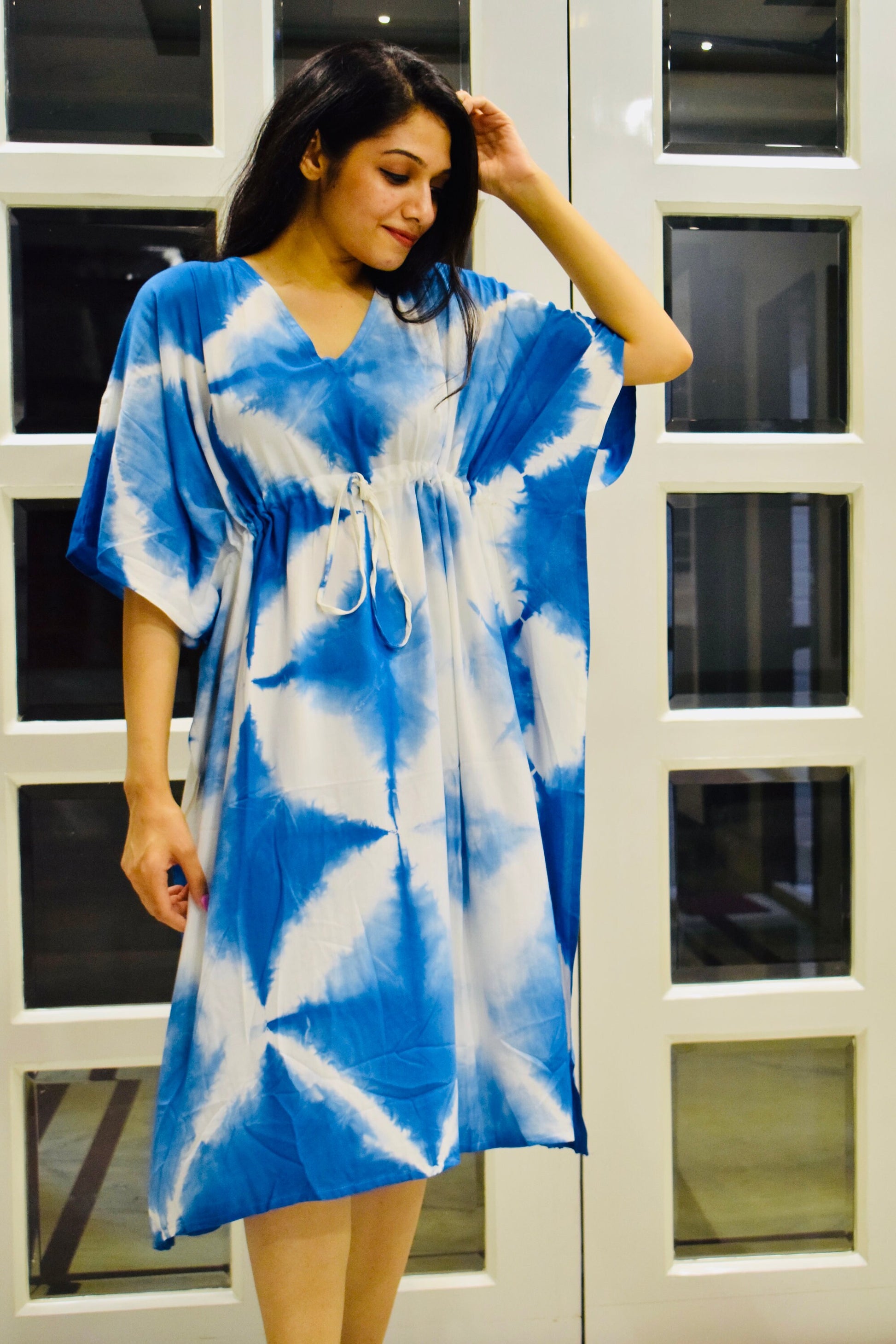 Indulge in bohemian elegance with our Rayon Tie Dye Short Kaftan featuring a stunning Blue Shibori print. Handcrafted from premium rayon fabric, this kaftan offers unparalleled softness and versatility.