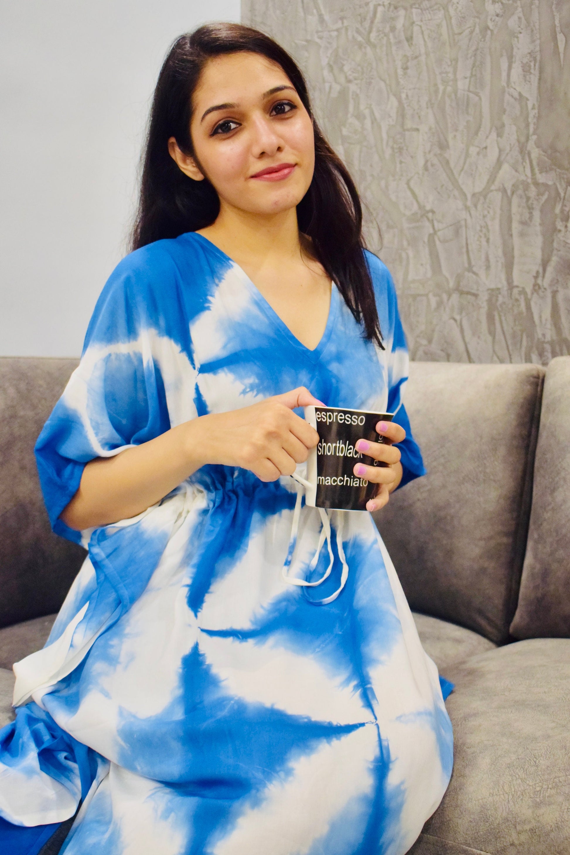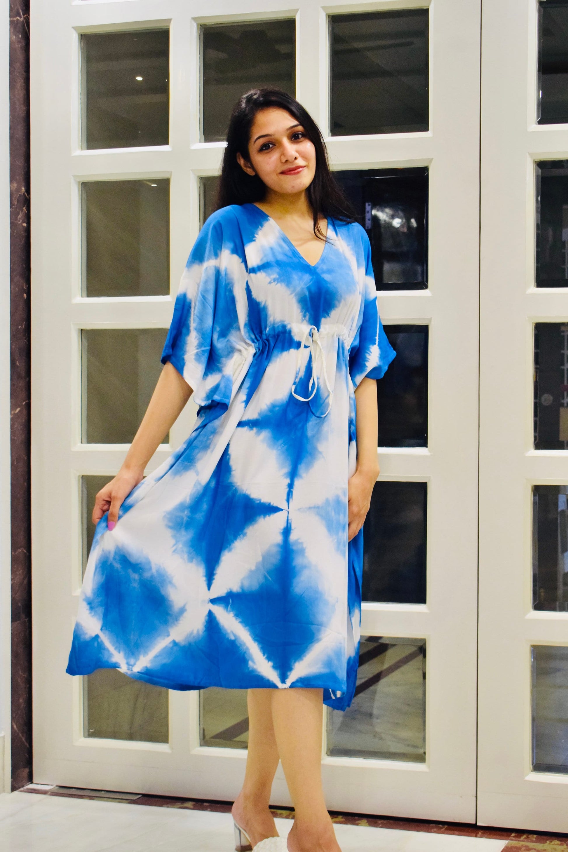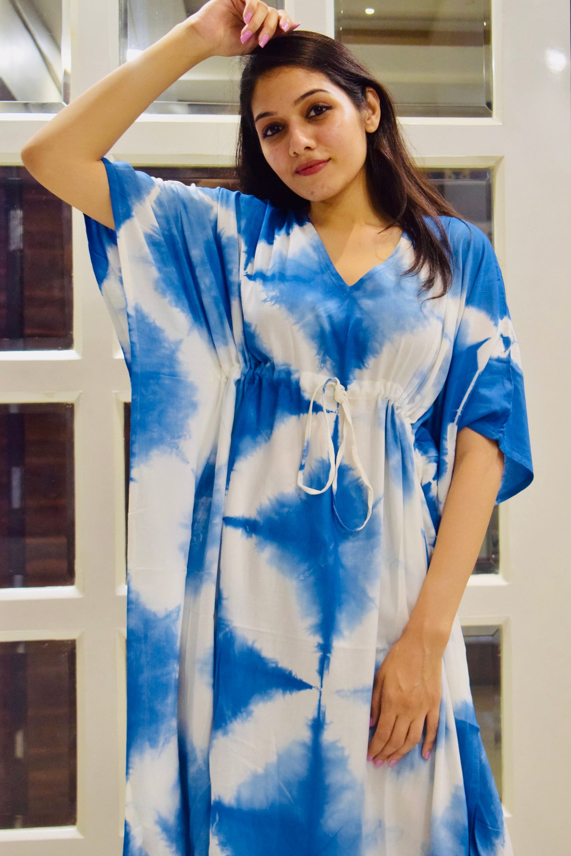 Indulge in bohemian elegance with our Rayon Tie Dye Short Kaftan featuring a stunning Blue Shibori print. Handcrafted from premium rayon fabric, this kaftan offers unparalleled softness and versatility.