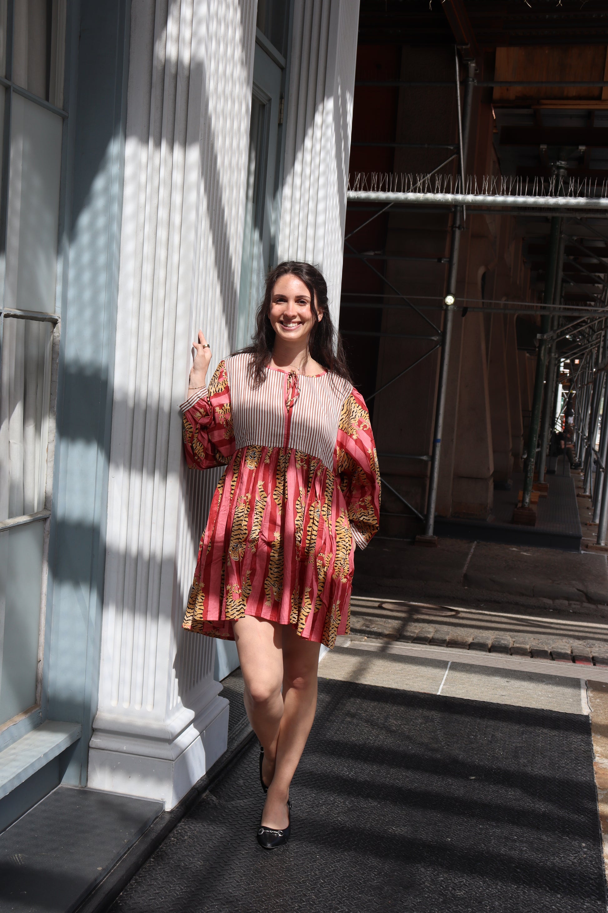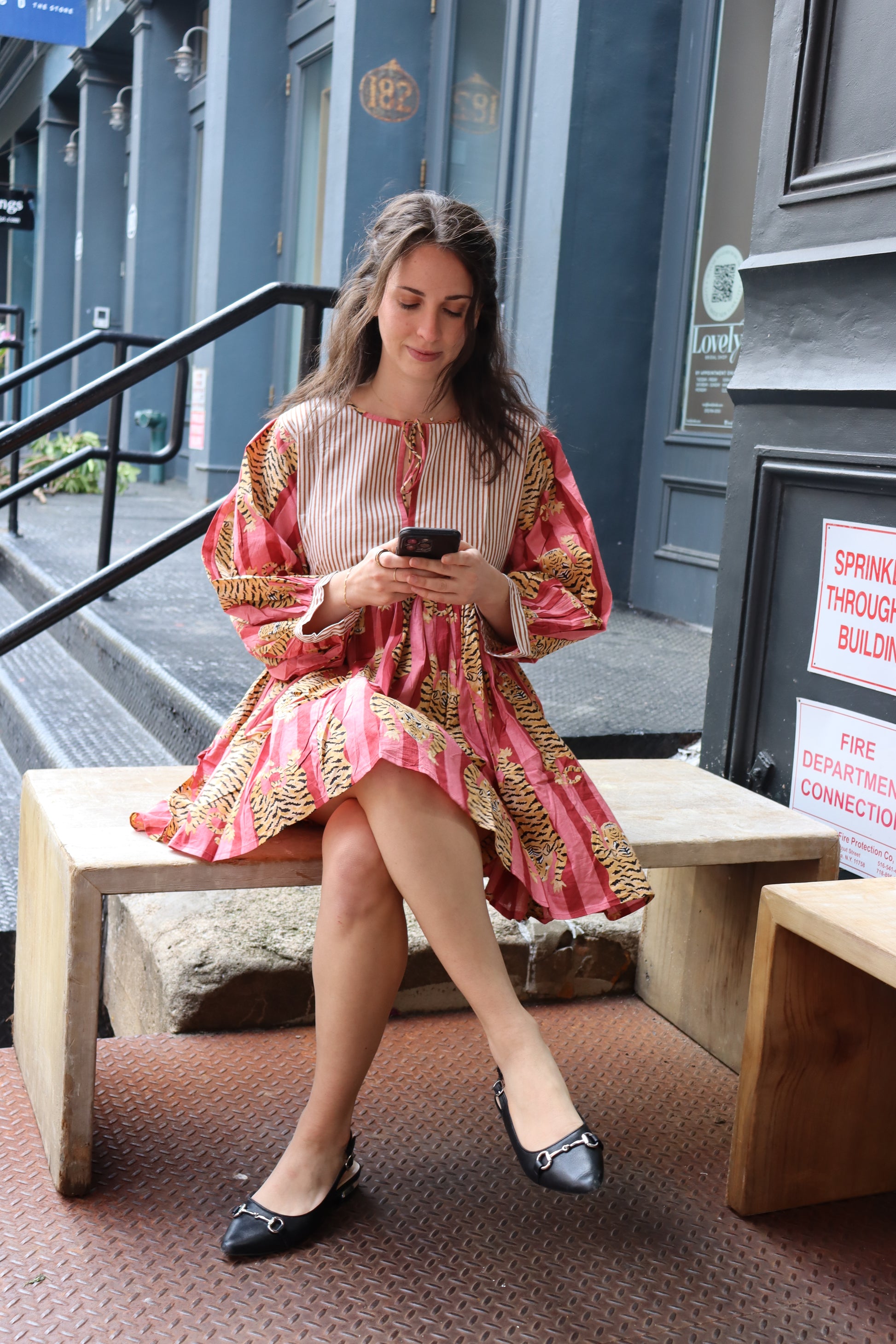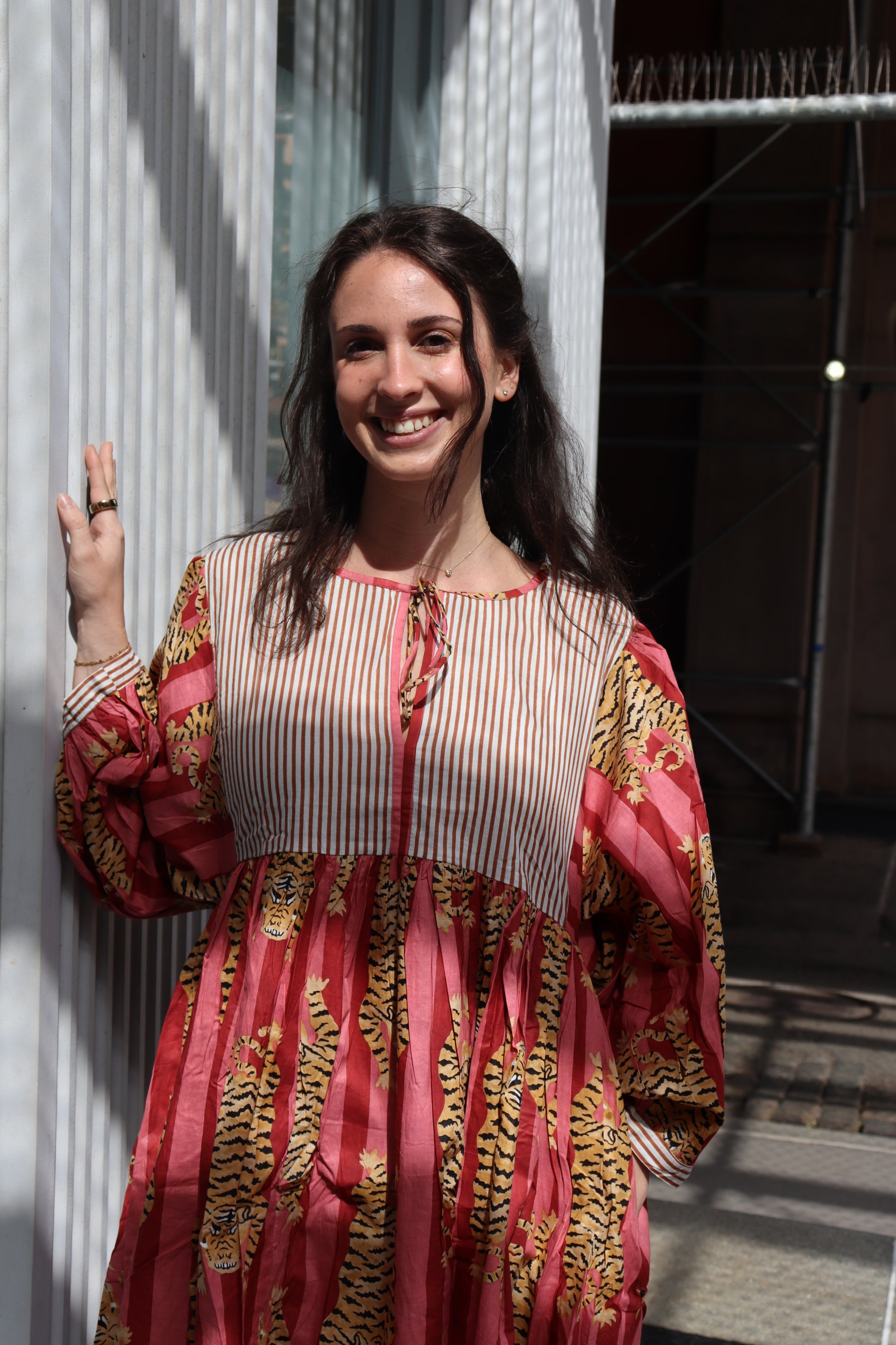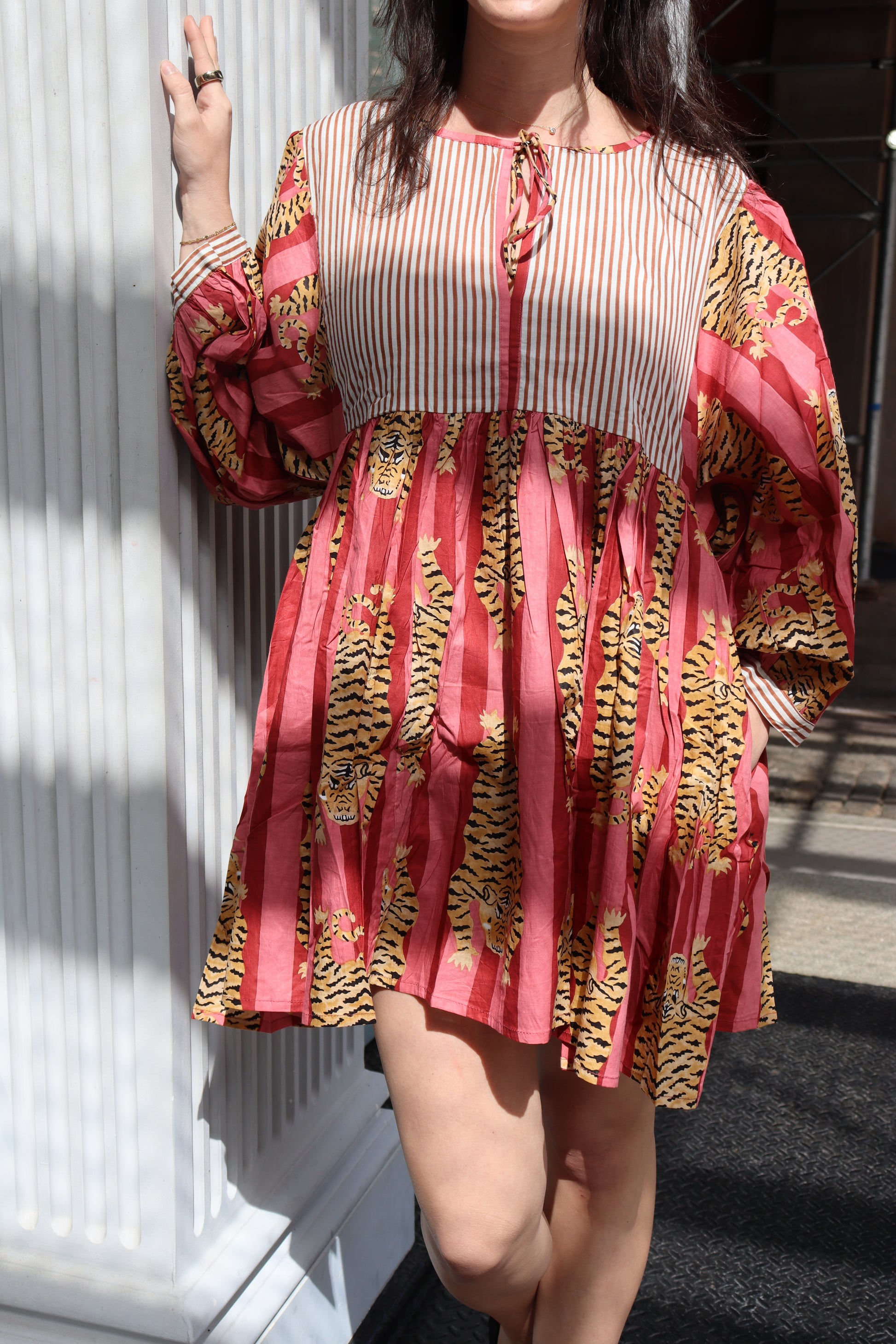 Bold energy with this striking Red, Roar & Roam Dress, featuring a hand block-printed tiger on vibrant red stripes. This dress is a head-turner for sunny strolls, brunches, or creative days out.