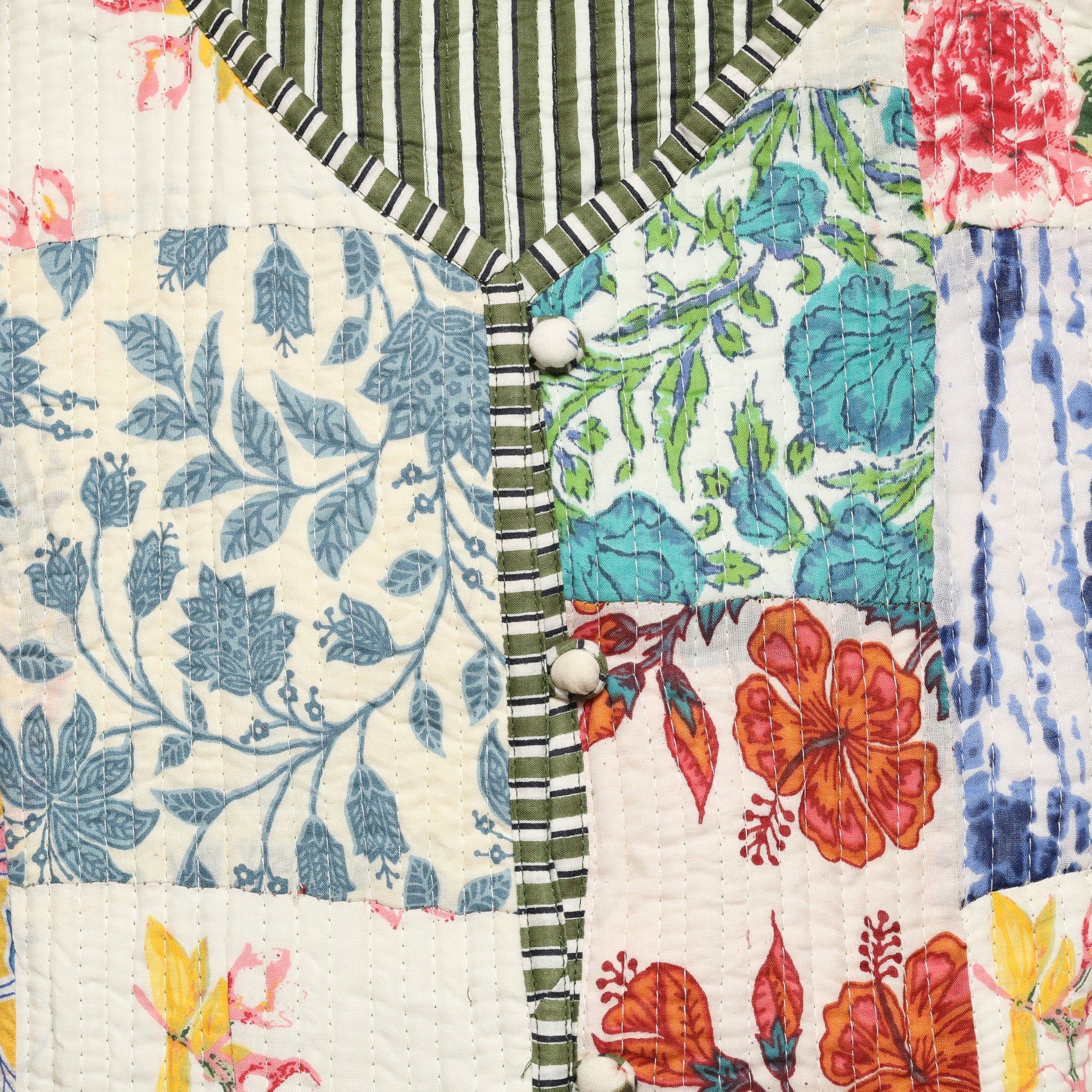 - The charming patchwork design of this reversible quilted jacket includes floral motifs and various colors of white.