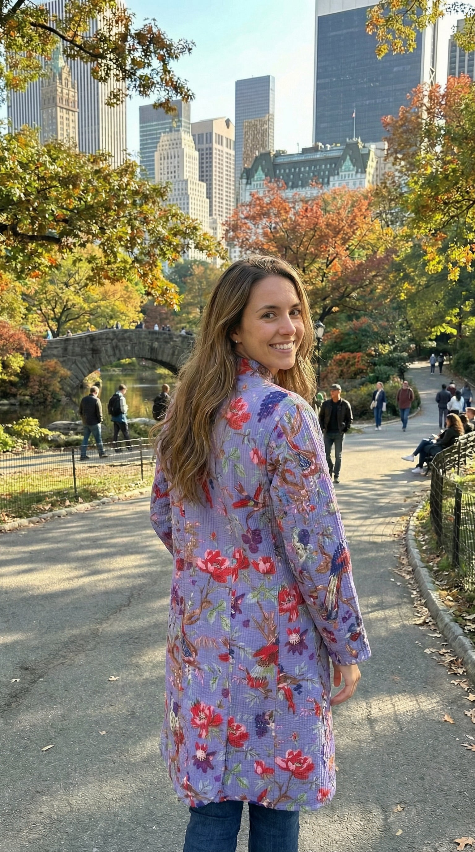 A long coat with vibrant floral patterns that brings the energy of city streets and blooming gardens together — perfect for turning winter into a street-style statement. Best paired with tights, ankle boots and minimalist shorts for a bold seasonal contrast.