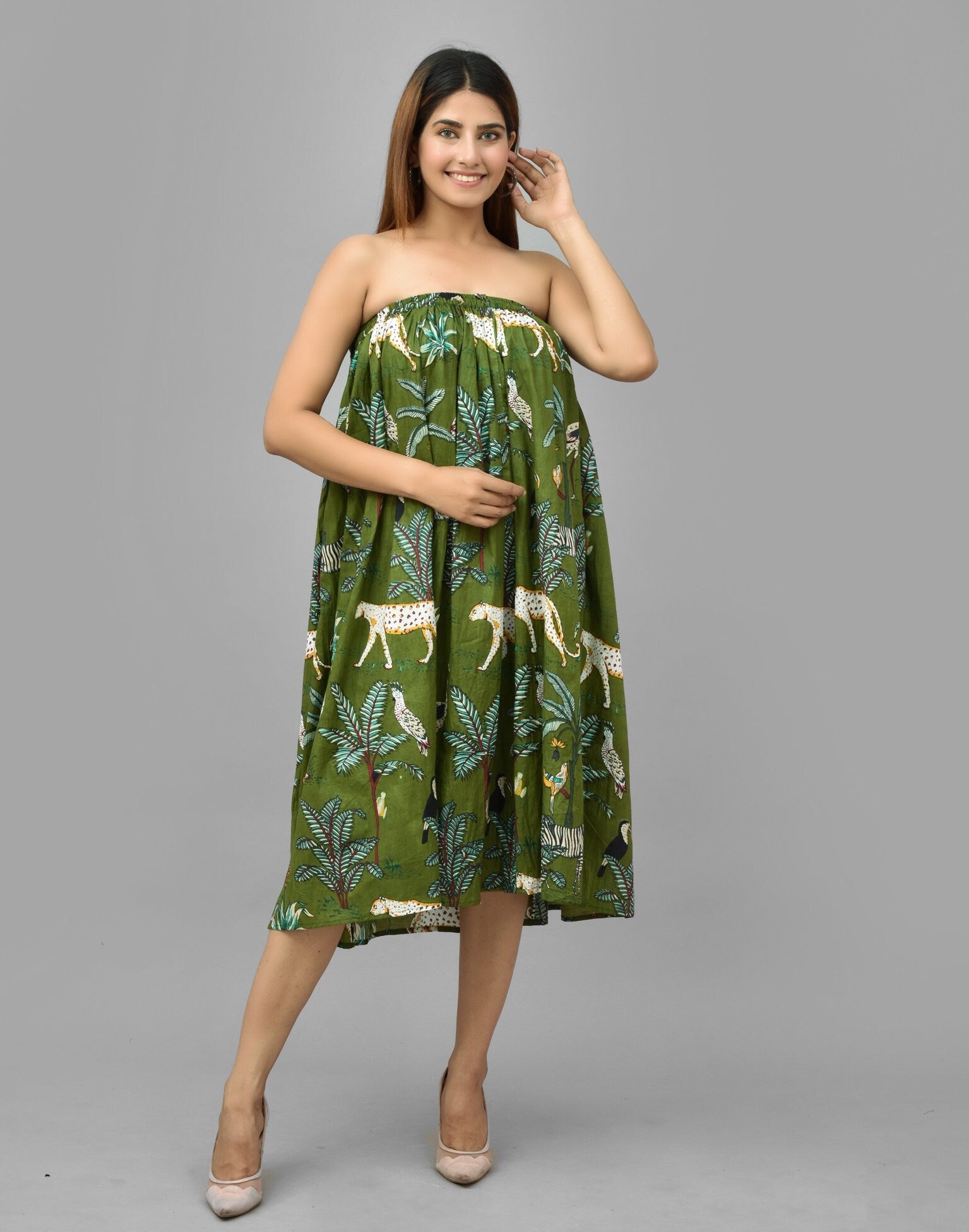 Green Tiger Print Cotton Skirt, Tunic Floral Long Skirt, Beach Maxi Poncho Dress, Bridesmaid Gown Summer Clothing, Jungle Print Skirt