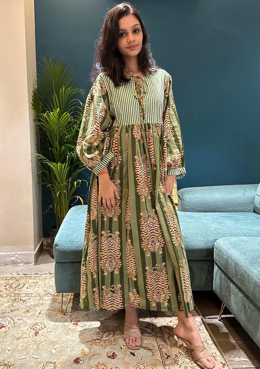 Tiger Block Printed Midi Dress - Green