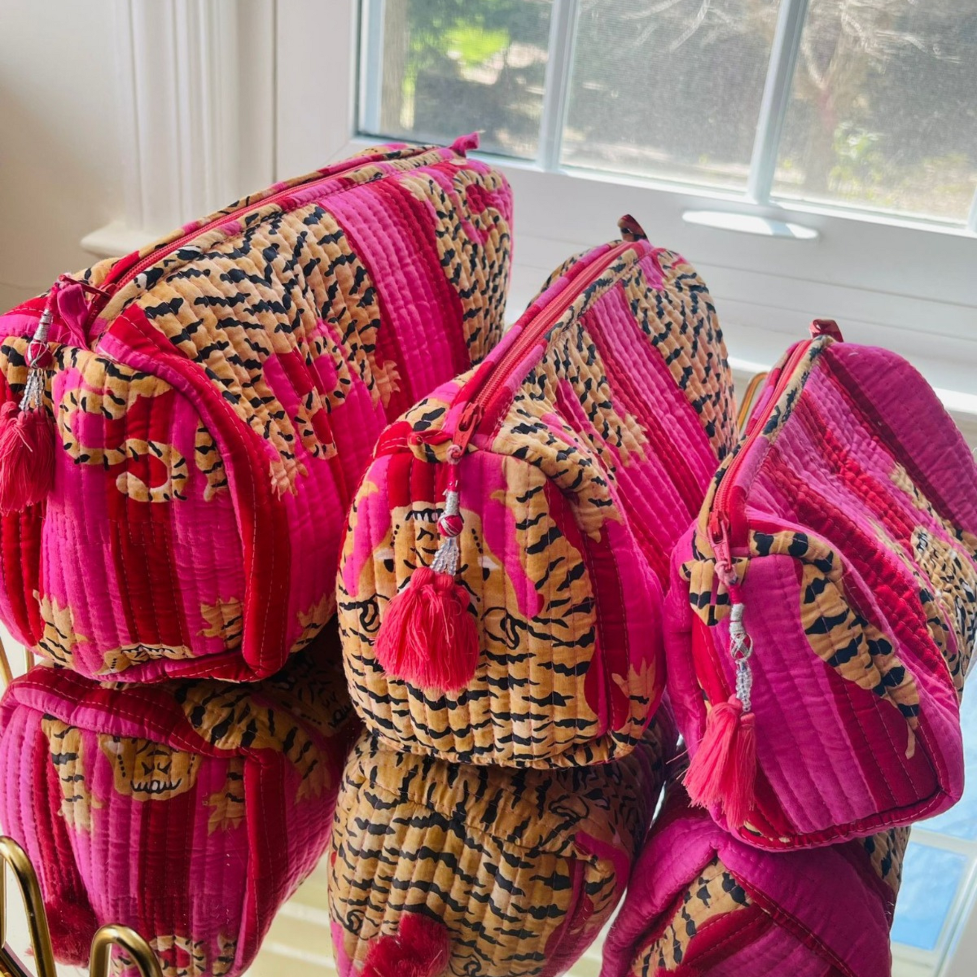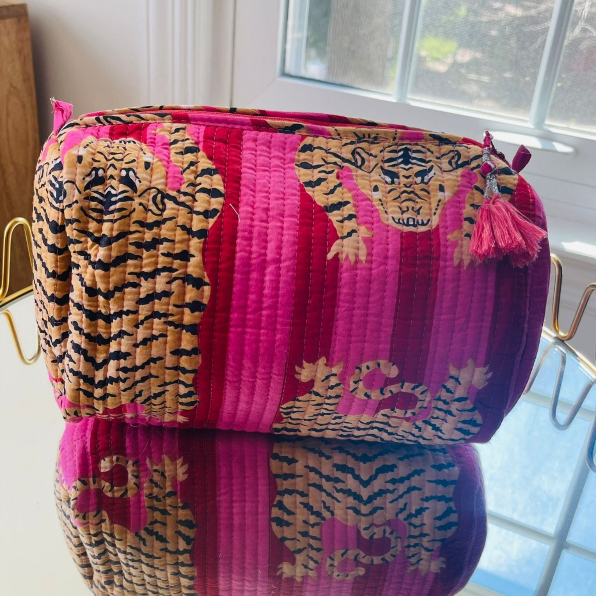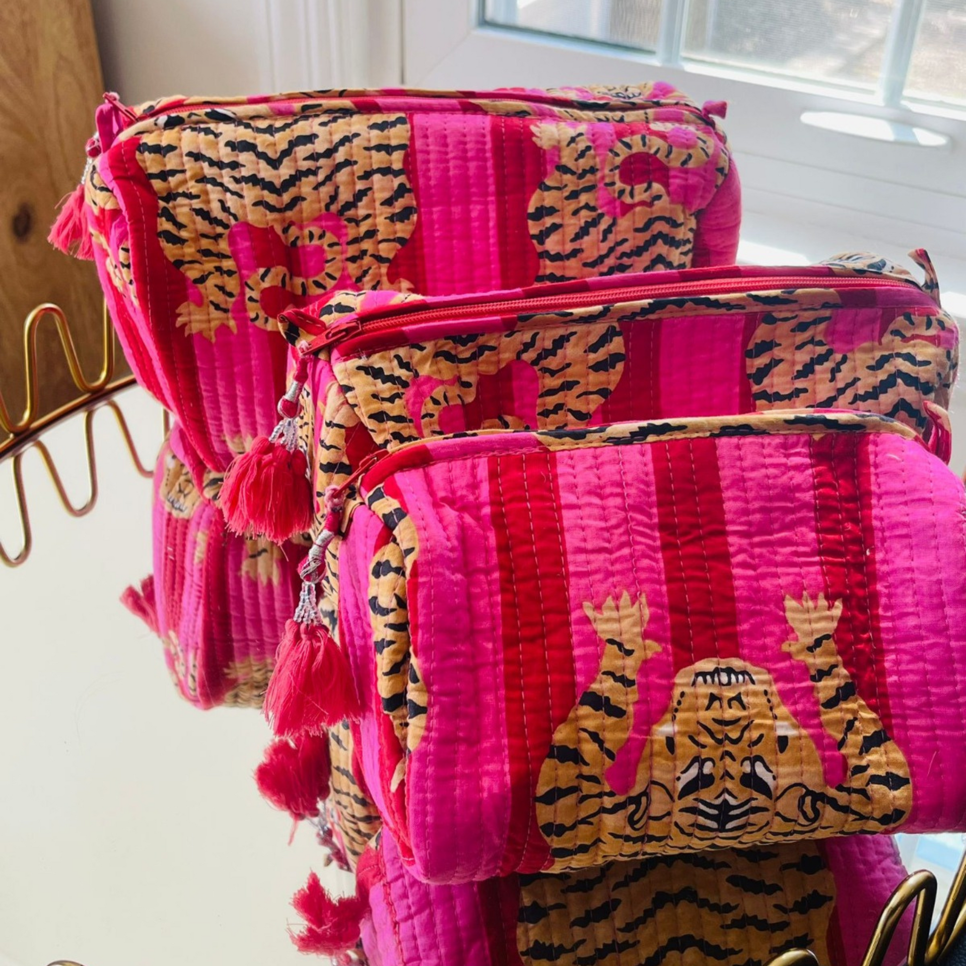 Tiger Block Printed Toiletry Bag in Pink - Set of 3