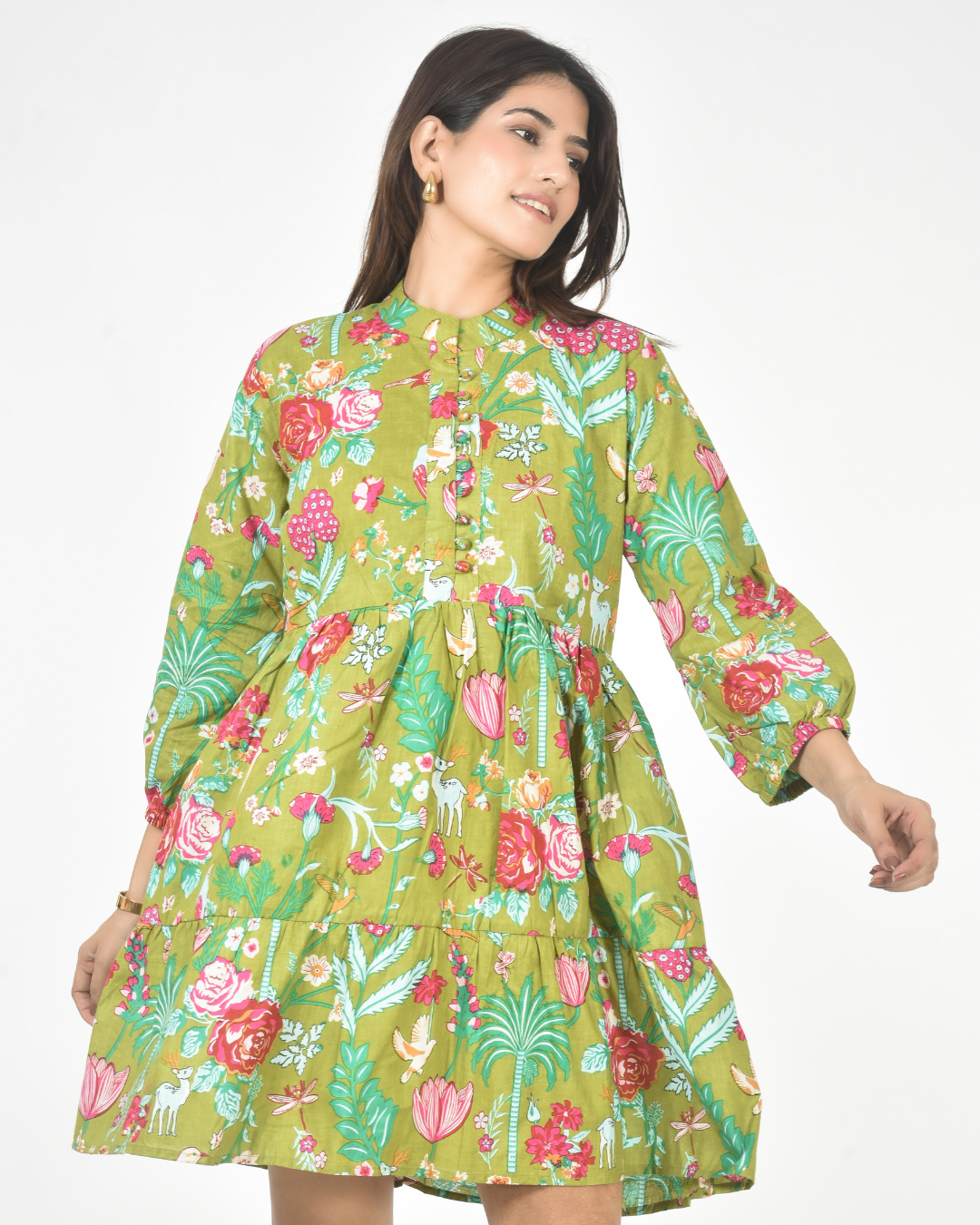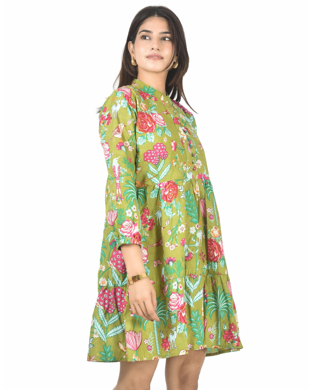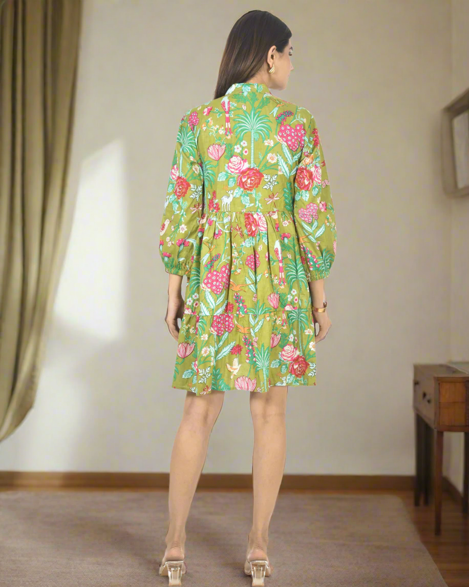 Breezy, bold, and beautifully made – this Verdant Bloom Tiered Cotton Dress is your go-to for sun-soaked days and laid-back evenings. This mini dress features a vibrant botanical print with bold florals and subtle birds.