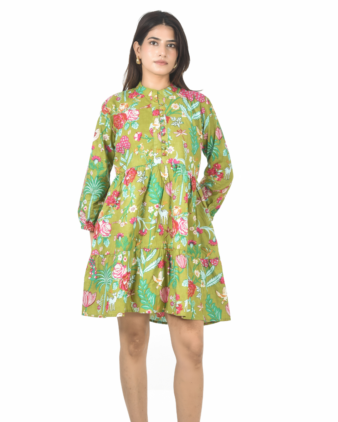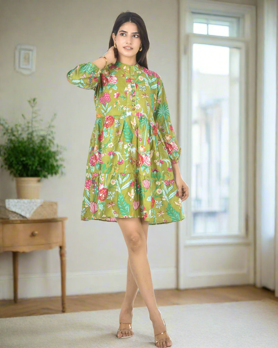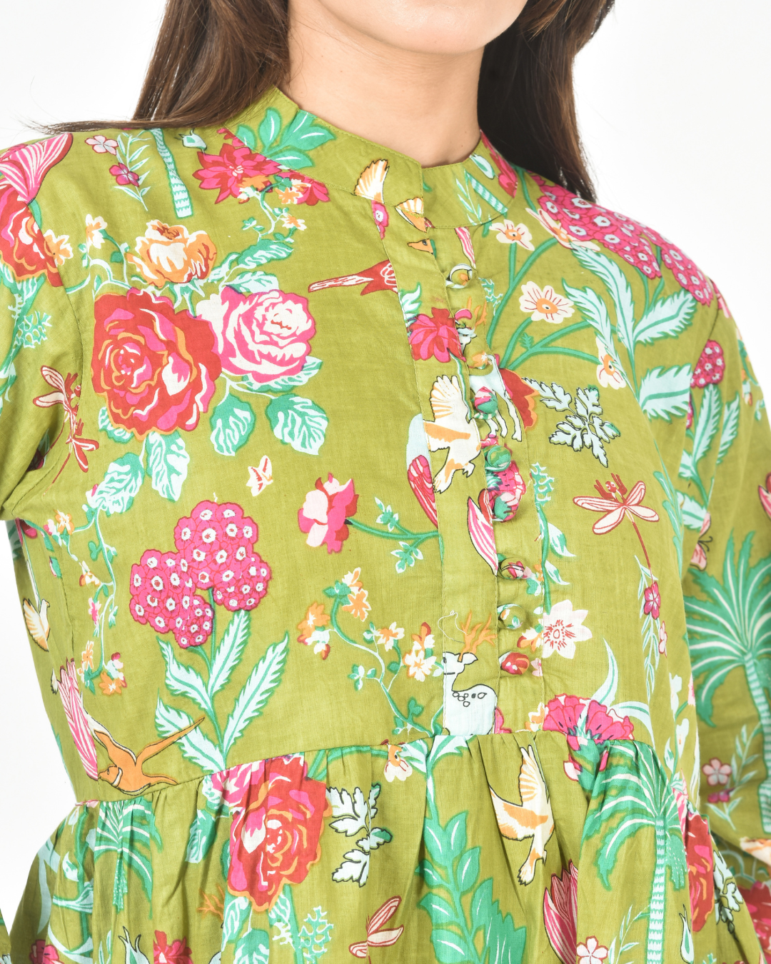 Breezy, bold, and beautifully made – this Verdant Bloom Tiered Cotton Dress is your go-to for sun-soaked days and laid-back evenings. This mini dress features a vibrant botanical print with bold florals and subtle birds.
