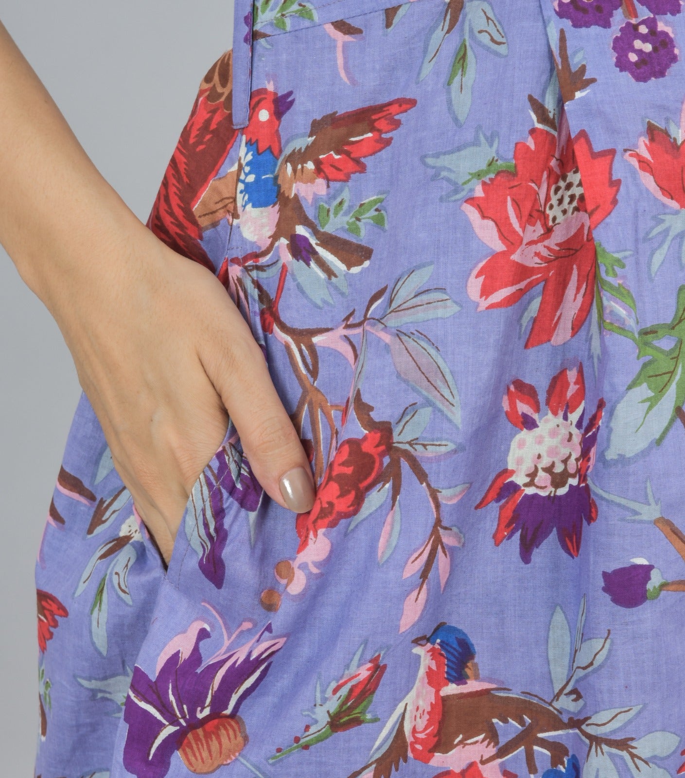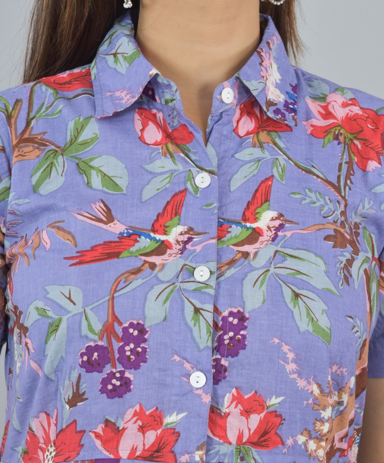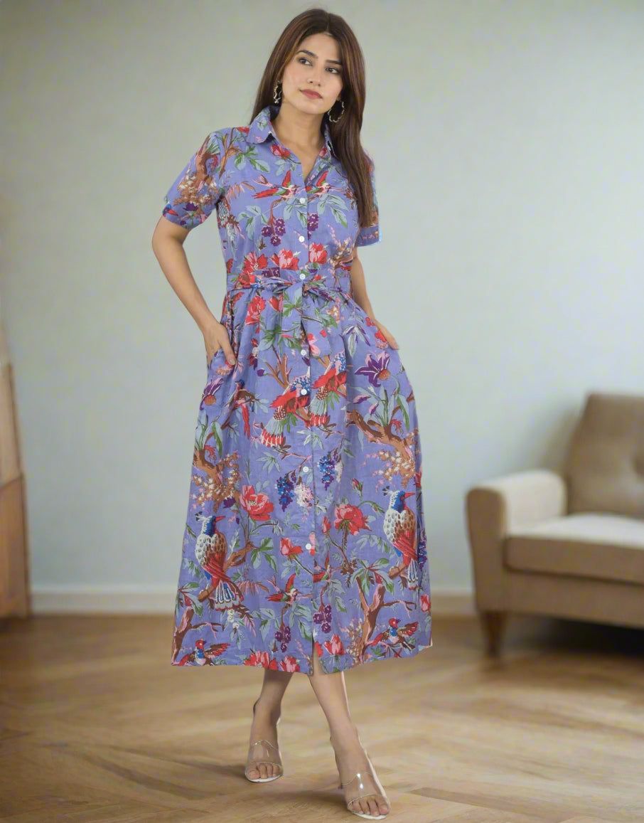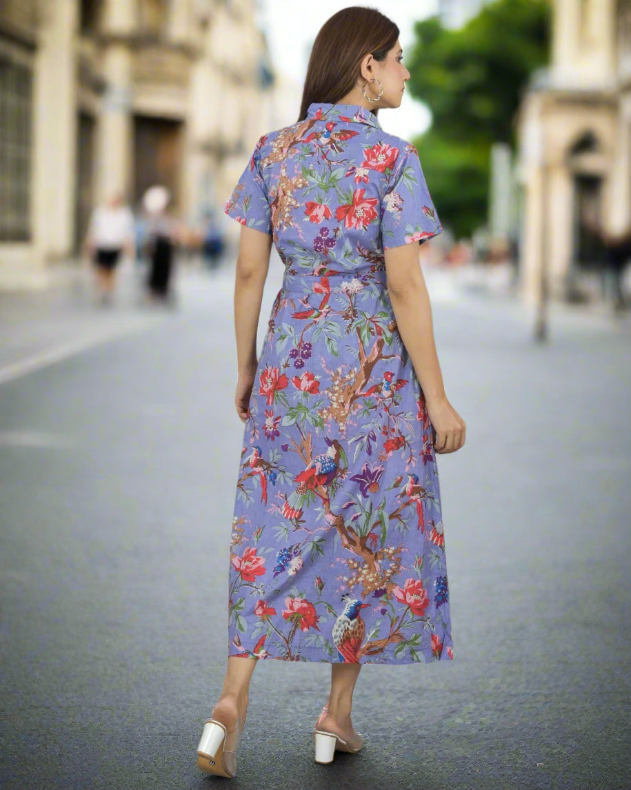 Step into effortless elegance with our lavender floral button-down midi dress, crafted in soft, breathable cotton. Featuring a vibrant tropical print with birds and blossoms, this dress blends comfort with chic sophistication. The collared neckline, short sleeves, and waist tie create a flattering, relaxed silhouette perfect for brunches, vacations, or casual outings.