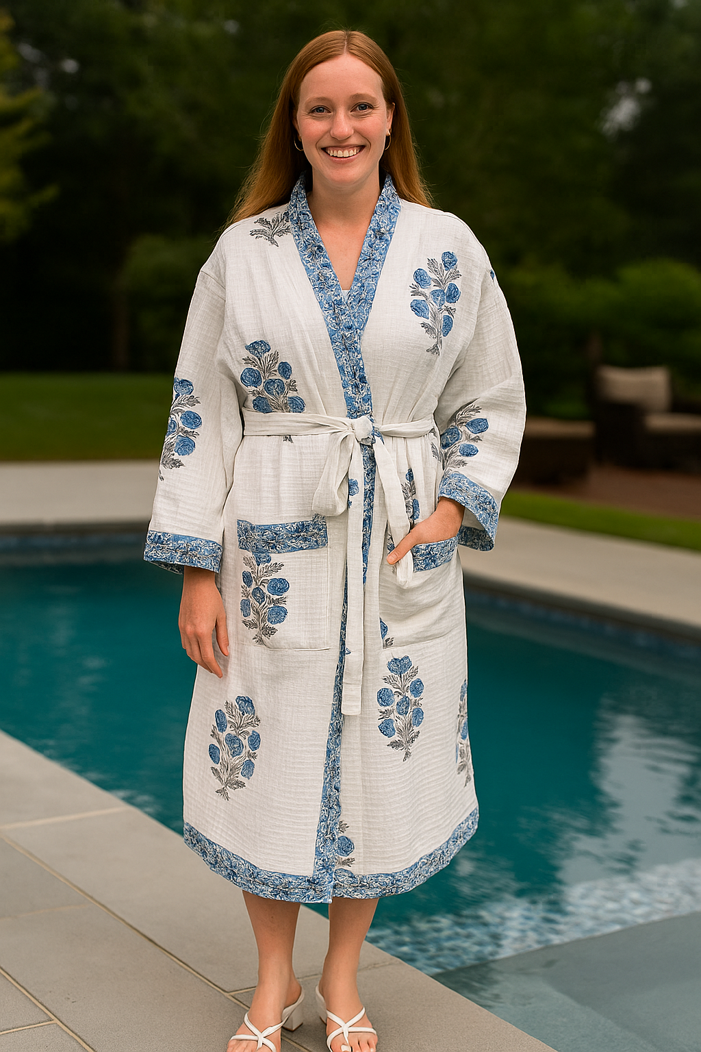 With a relaxed 52” length, practical side pockets, and flowy fit that flatters all shapes (yes, it’s plus-size friendly), this robe brings a boho-chic vibe to any setting. The block prints add a touch of artisanal charm—each print is one of a kind.