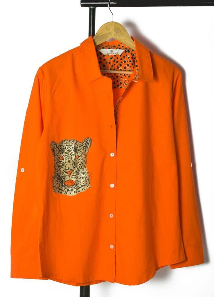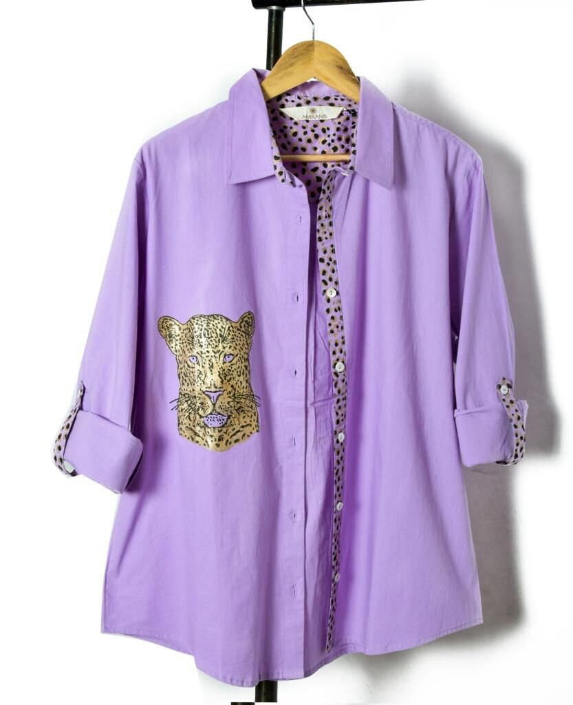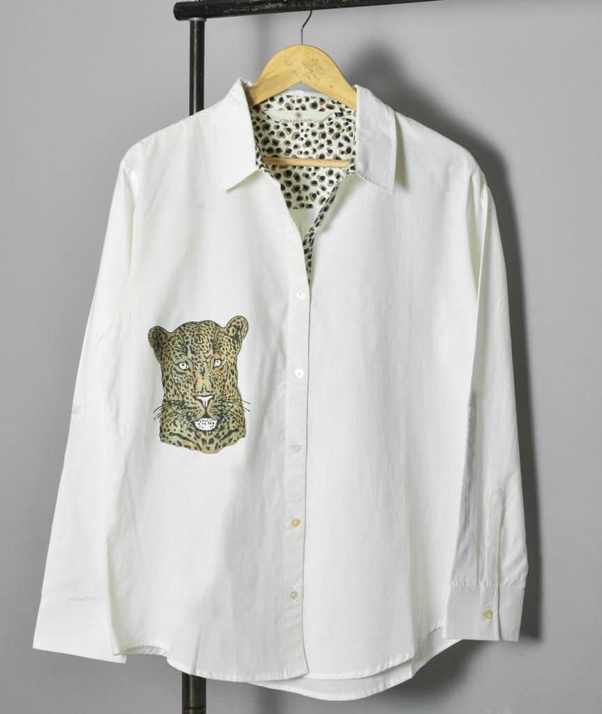 This chic cheetah print button-down shirt is a versatile piece that can be dressed up or down. Made from 100% organic cotton poplin, it's soft and comfortable to wear all day long. The classic button-down style and collared neck give it a polished look, while the cheetah print adds a touch of personality.