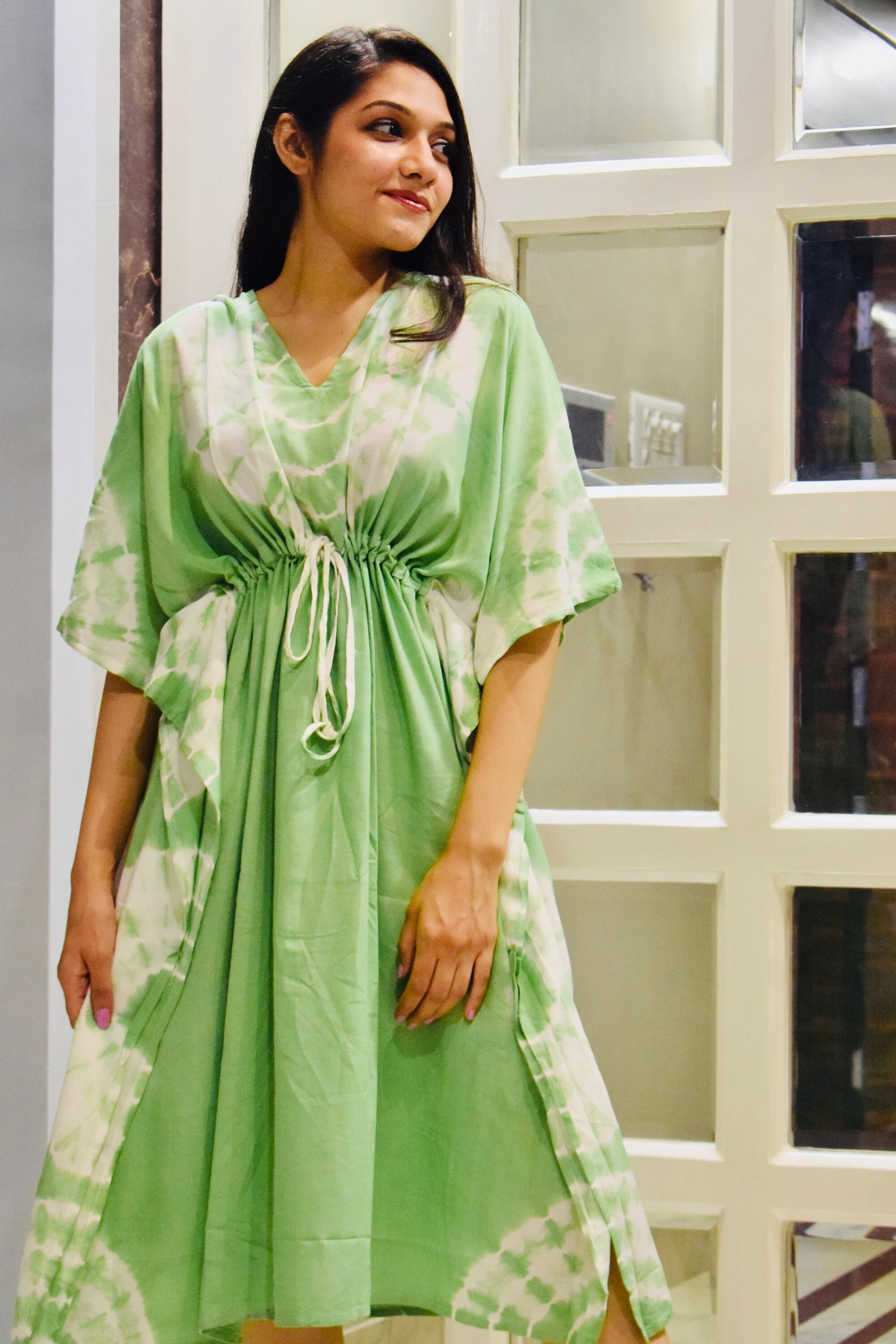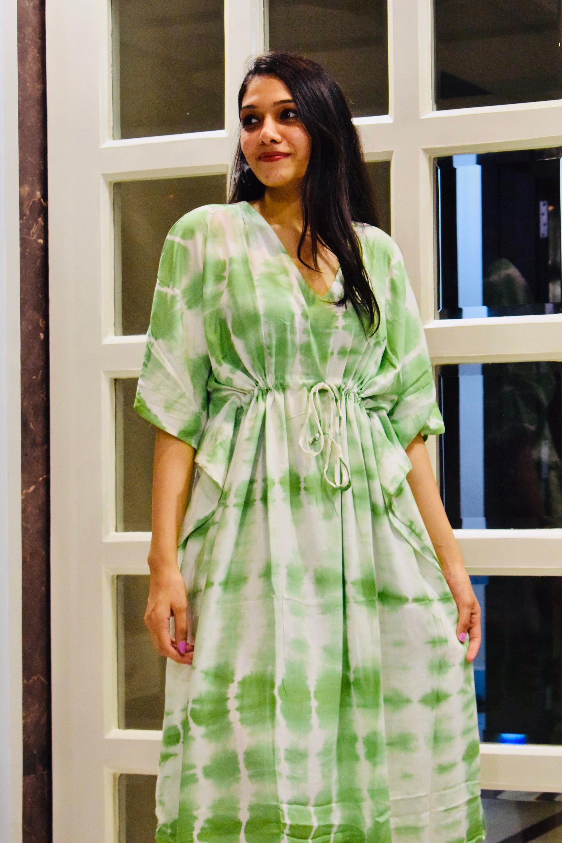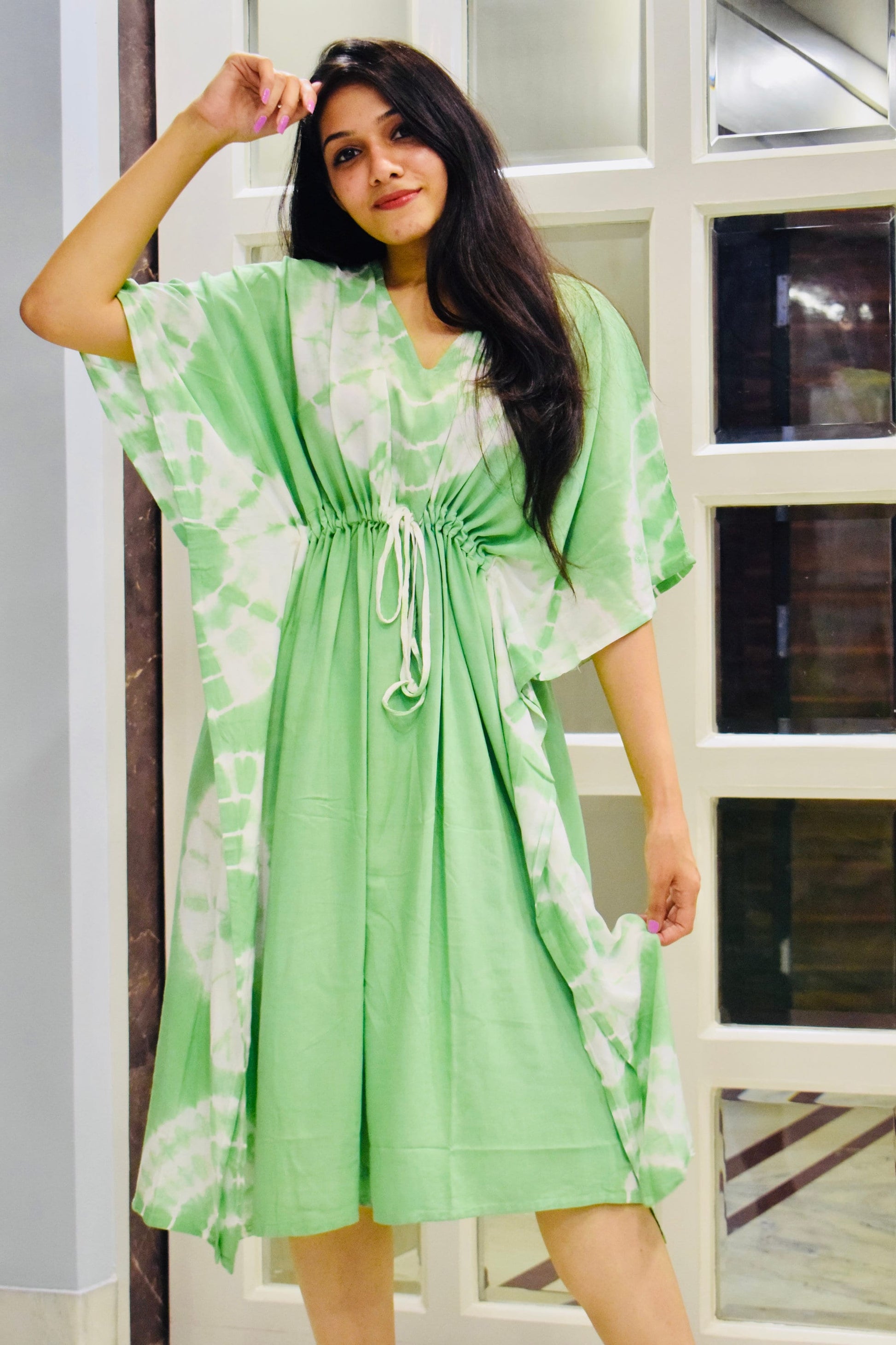 The dynamic tie-dye pattern introduces a burst of bohemian flair, making it the ideal companion for various occasions, whether it's a laid-back day at the beach or a casual evening out. Revel in the vibrant colors and effortless charm that define this chic kaftan.